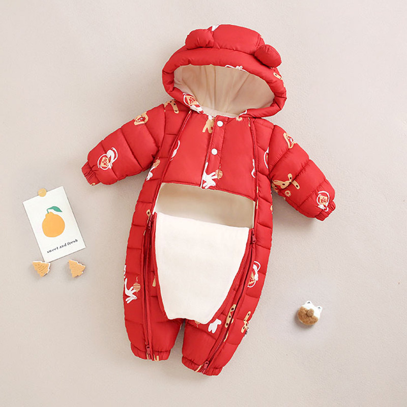 小猪大卫新生儿秋冬夹棉连体衣男女宝宝卡通印花中开保暖爬服
