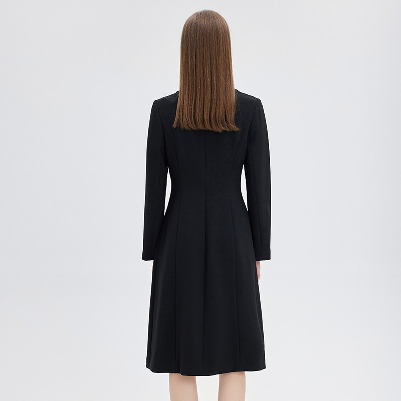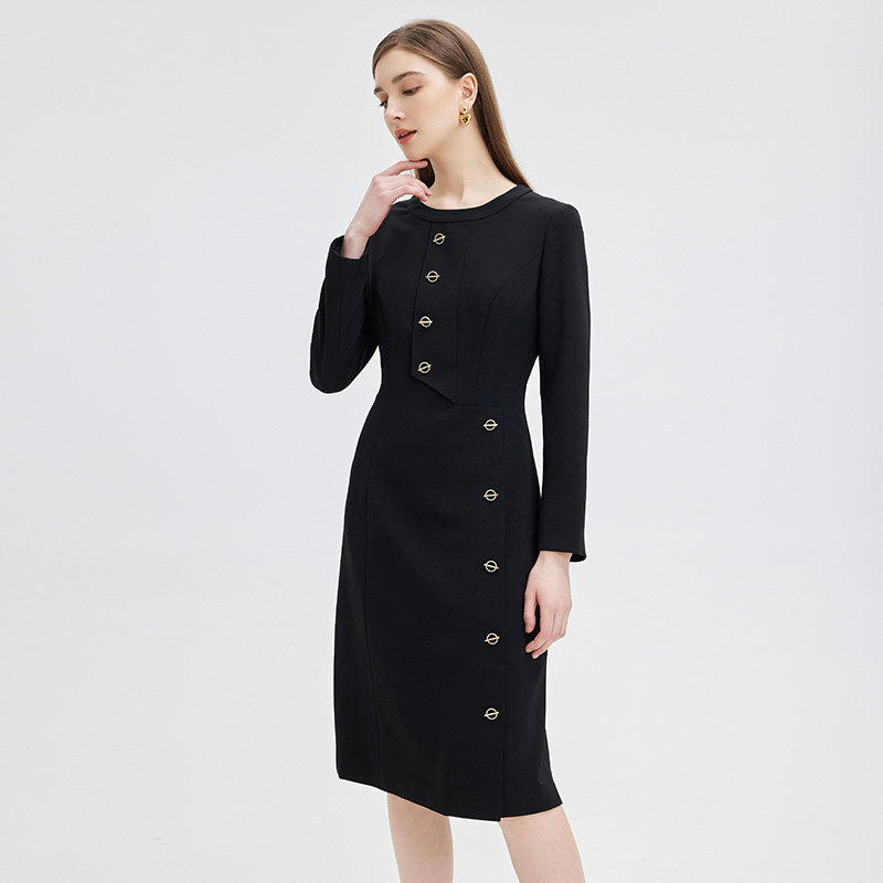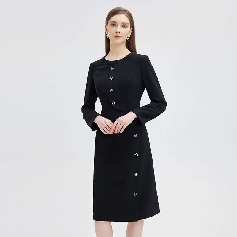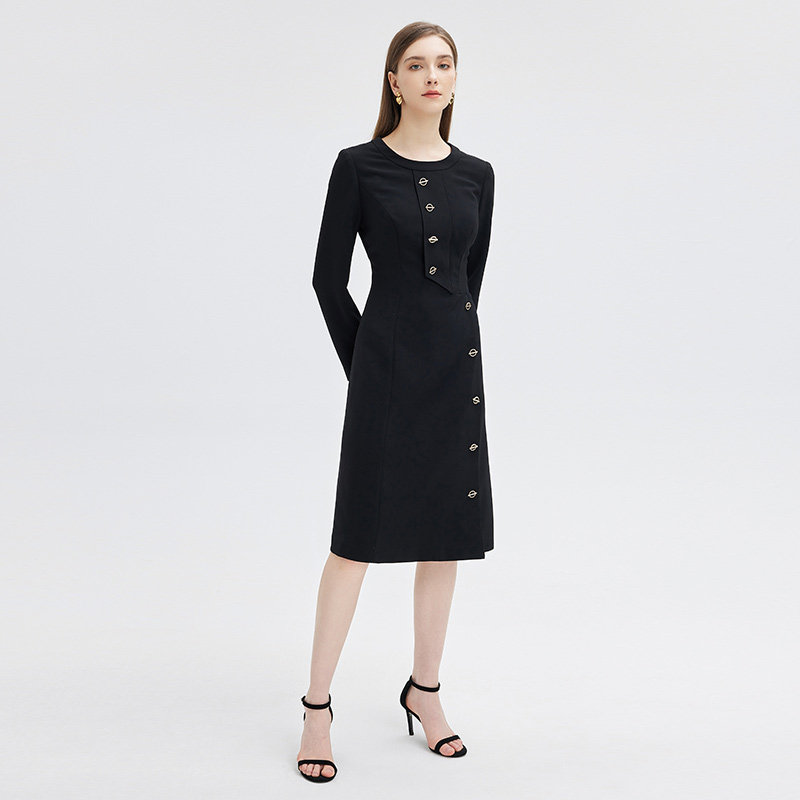 专柜正品马天奴秋冬秋冬黑色圆领连衣裙气质裙子修身长袖礼裙