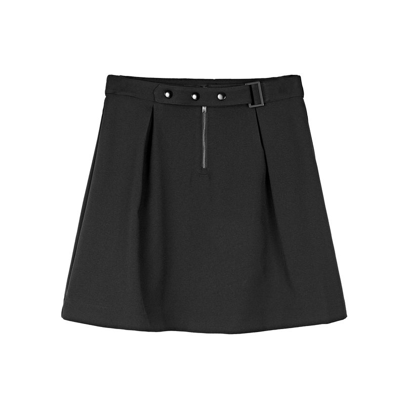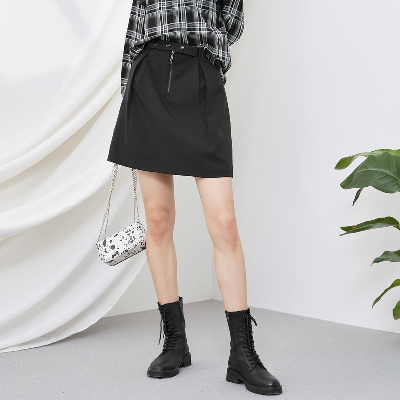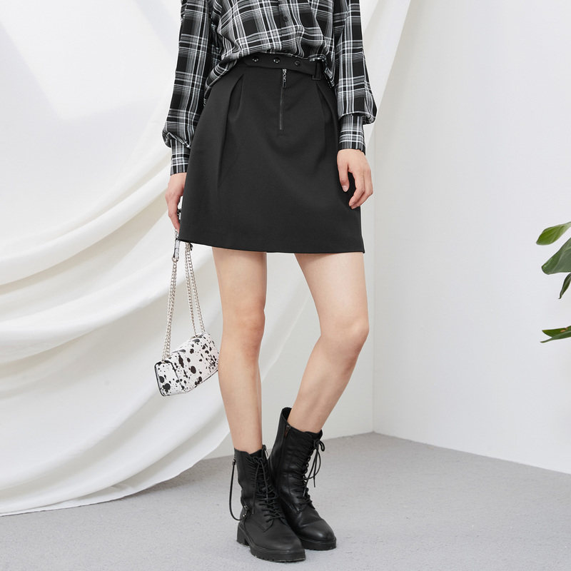 sdeer圣迪奥女装时尚休闲拼接压褶黑色A字短裙S21361304