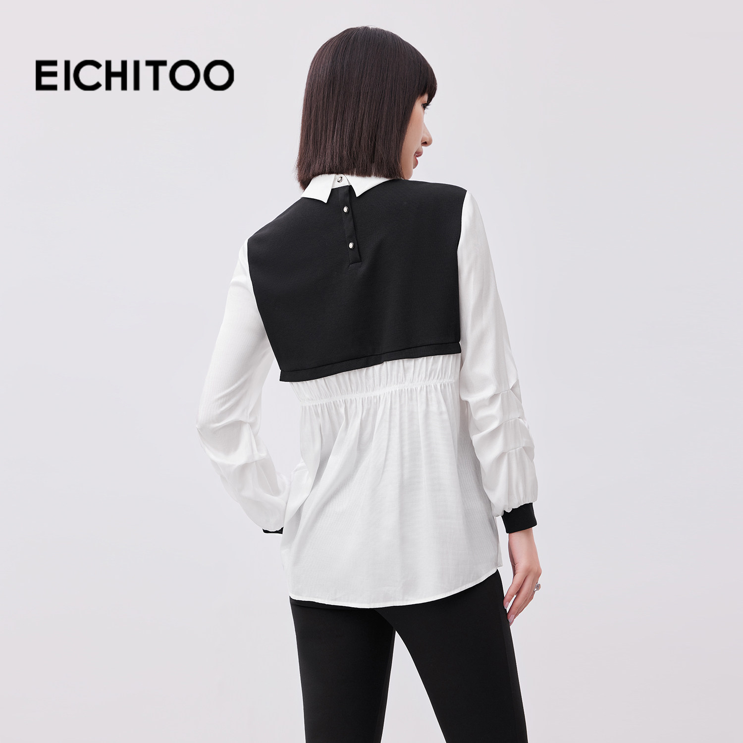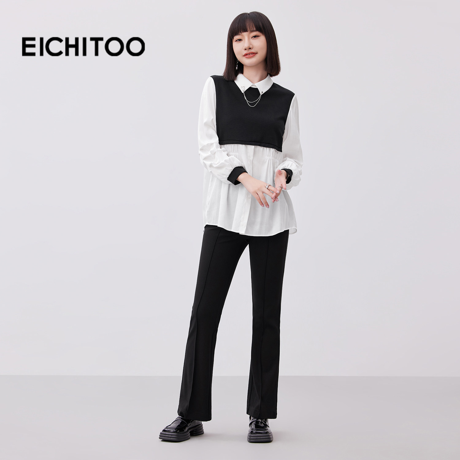 爱居兔黑白撞色设计感长袖衬衫女2026年春季新款翻领雪纺衫上衣
