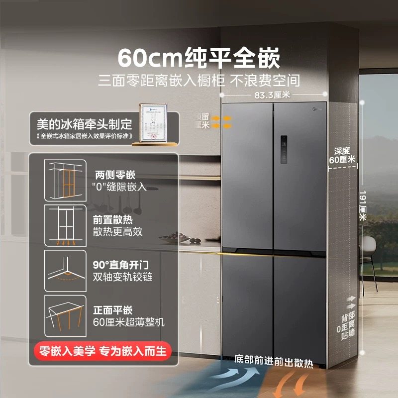 美的508L真香系列双系统超薄零嵌入式冰箱十字双开多门家用大容量