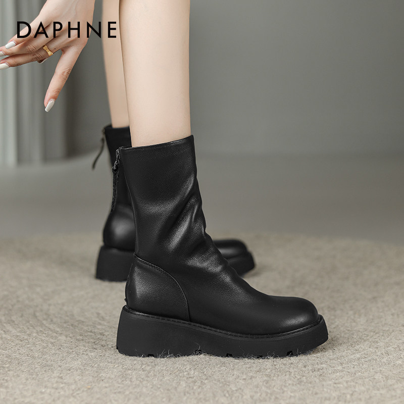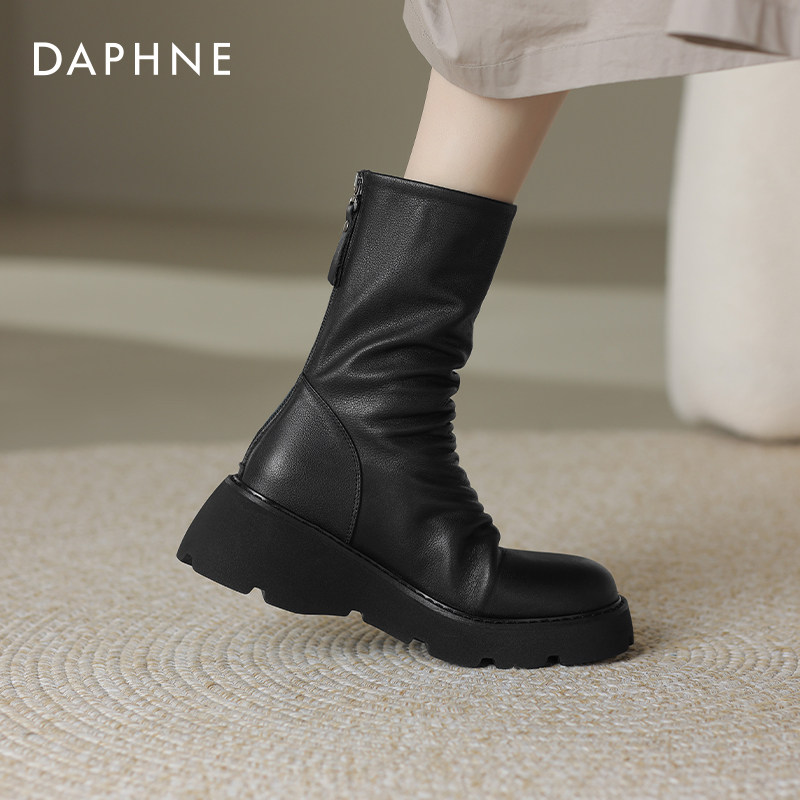 达芙妮马丁靴女款厚底中筒靴2026秋冬春款黑色高跟短靴坡跟瘦瘦靴