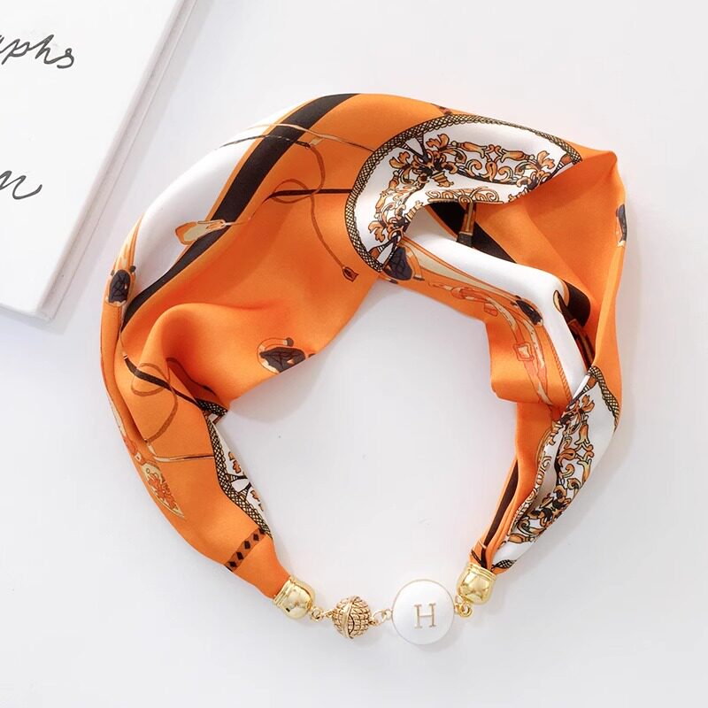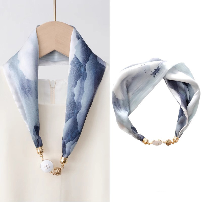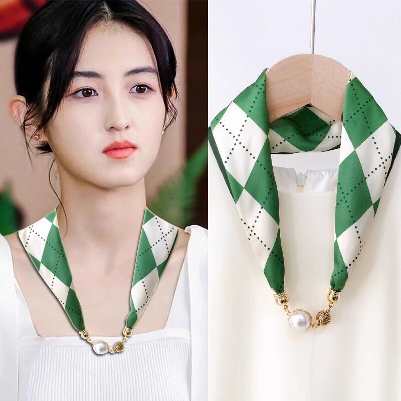 珍珠磁扣丝巾女小领巾复古百搭围巾