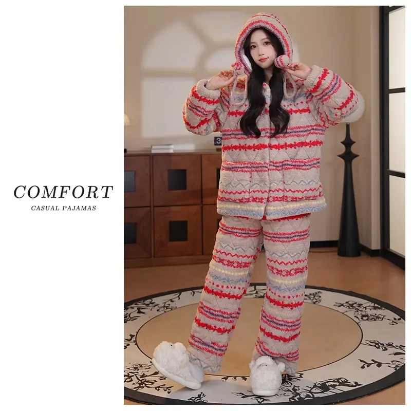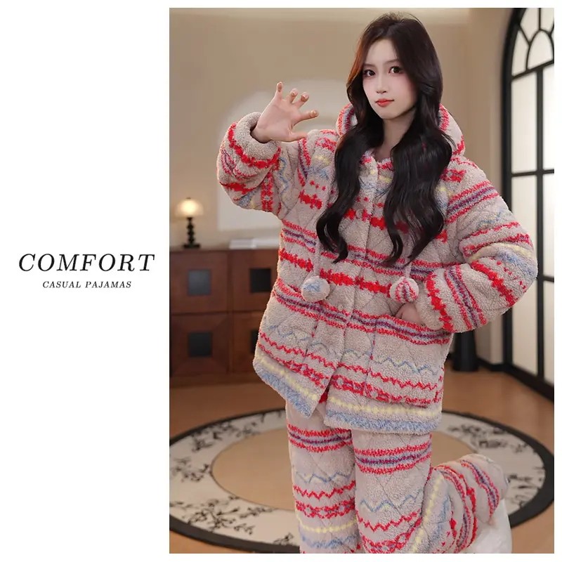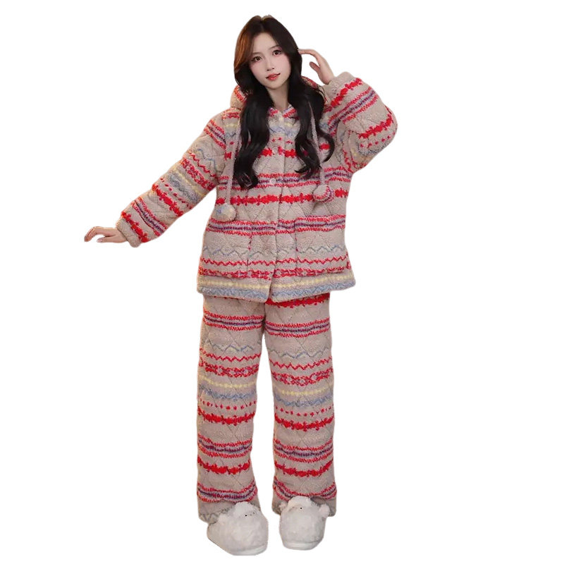 2025新款三层夹棉袄睡衣女款冬季保暖套装家居服珊瑚绒女士可外穿