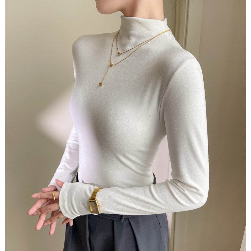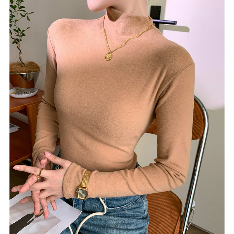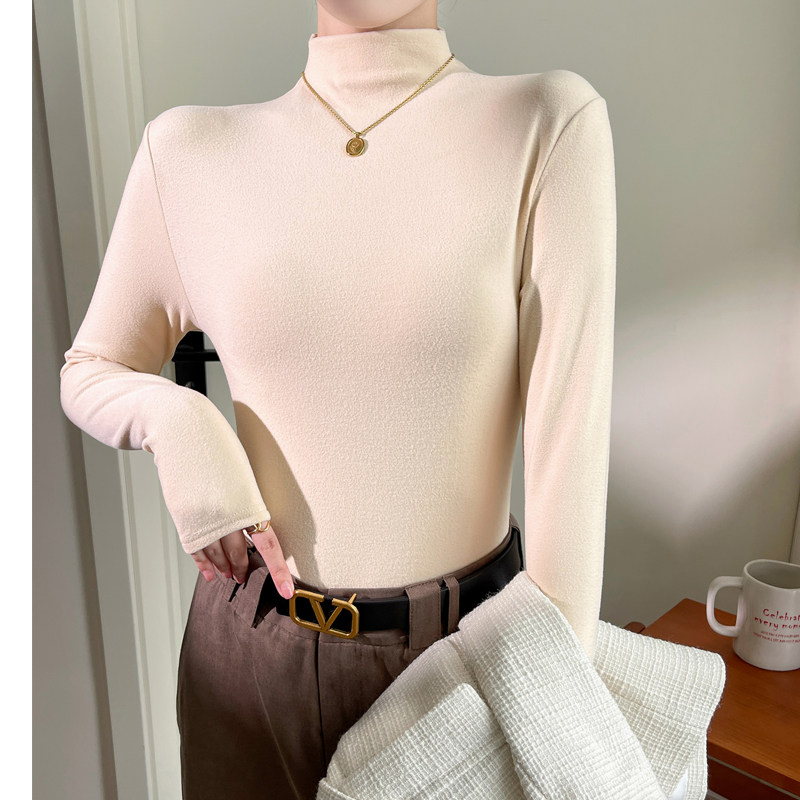 杏色半高领打底衫女冬季内搭加绒加厚双面德绒保暖高级感长袖上衣