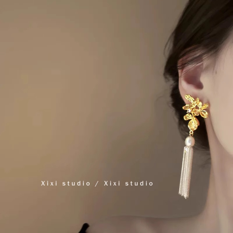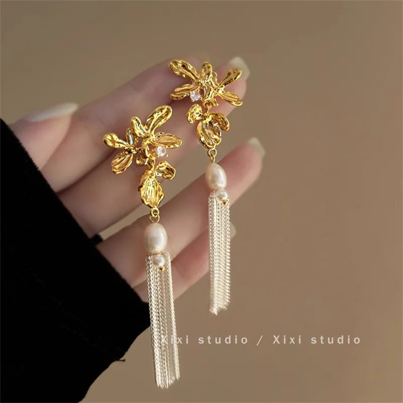 银针镶钻花朵人造珍珠耳环宫廷风轻奢流苏耳坠复古潮流耳饰女金色
