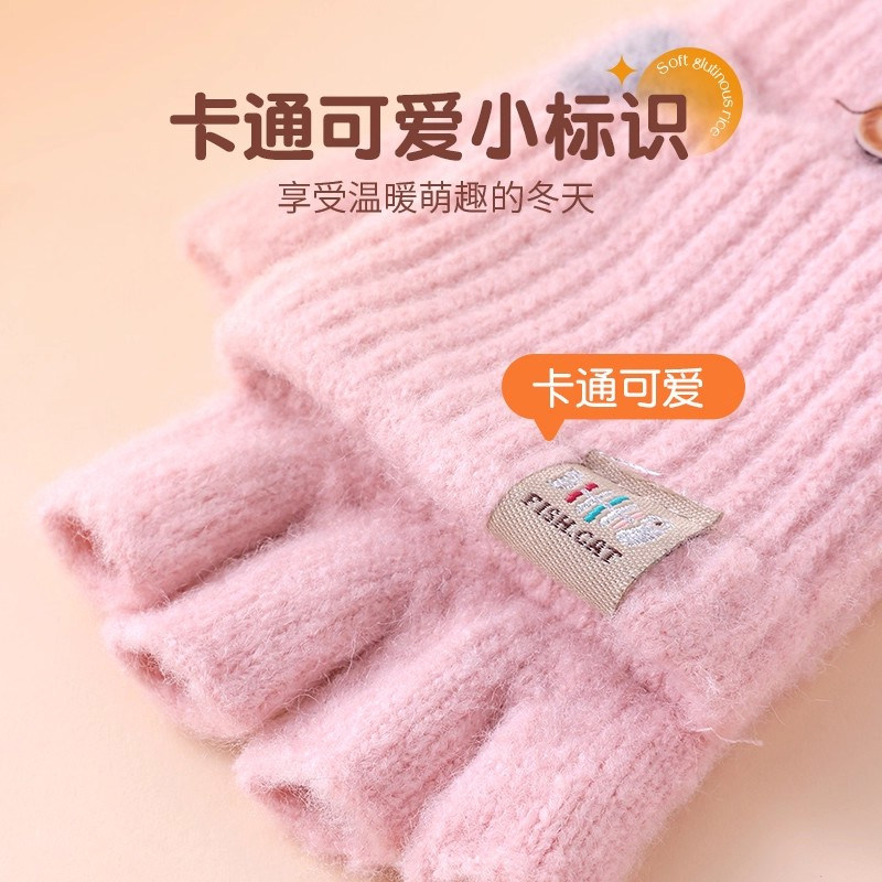 儿童手套冬天保暖露指学生写字女童中大童翻盖五指半指红色加绒