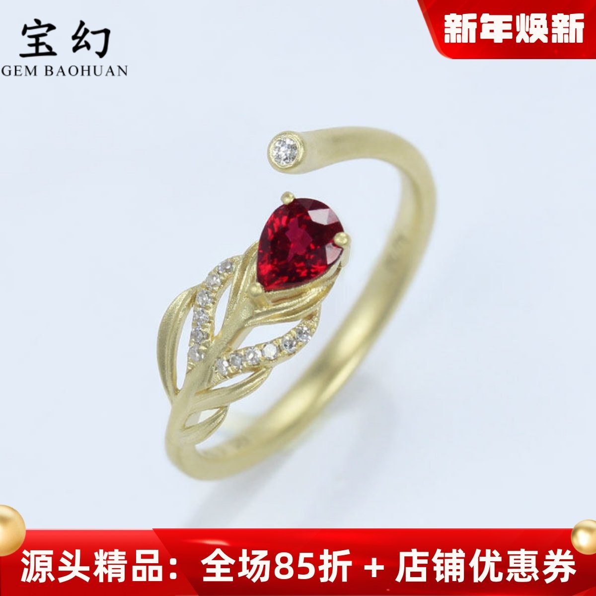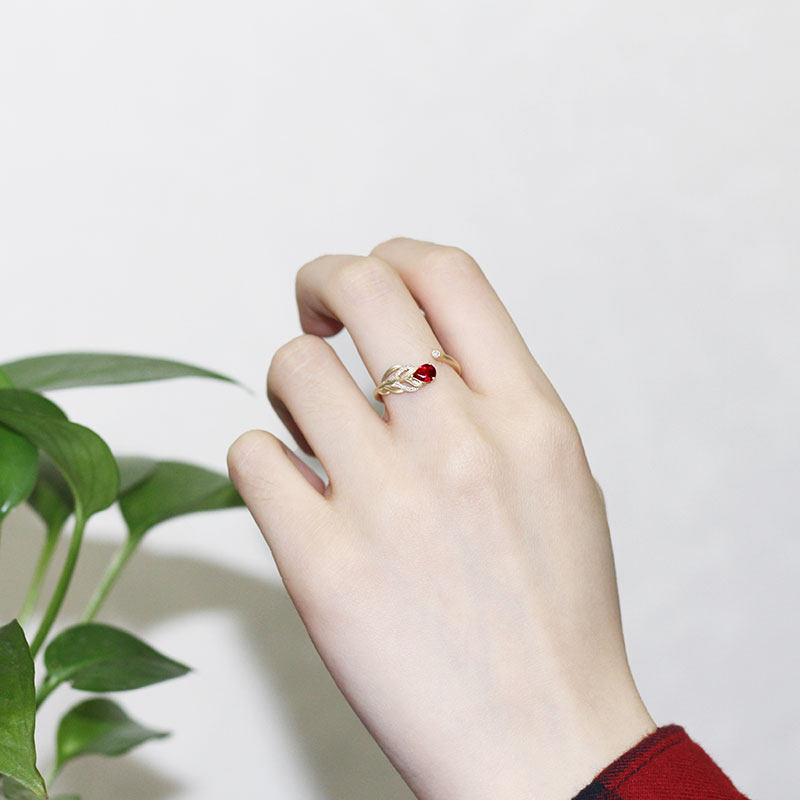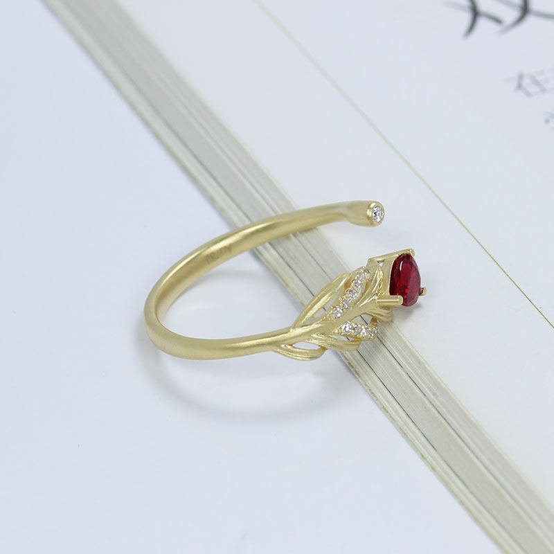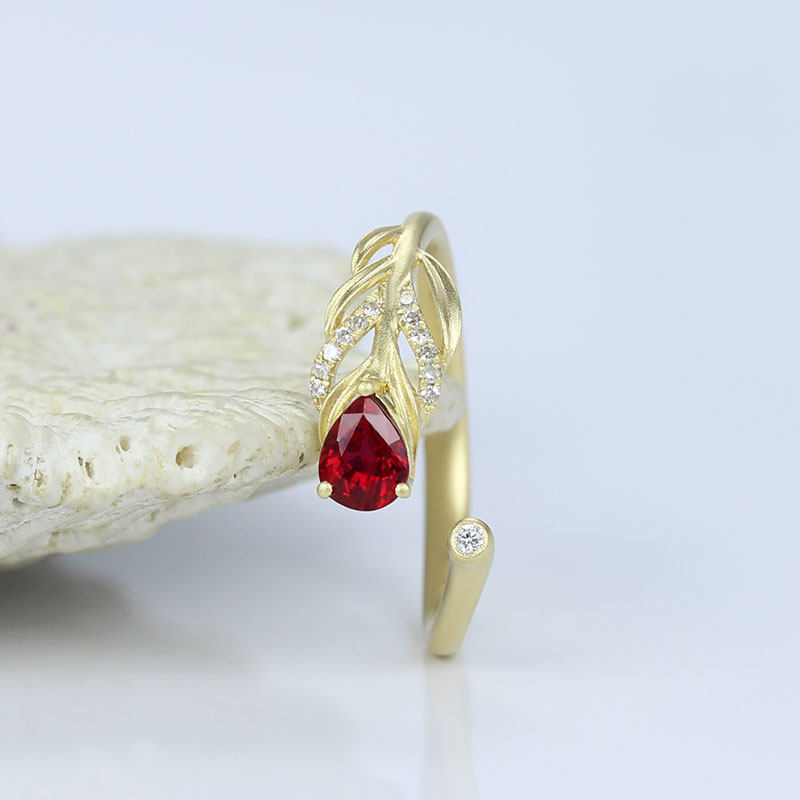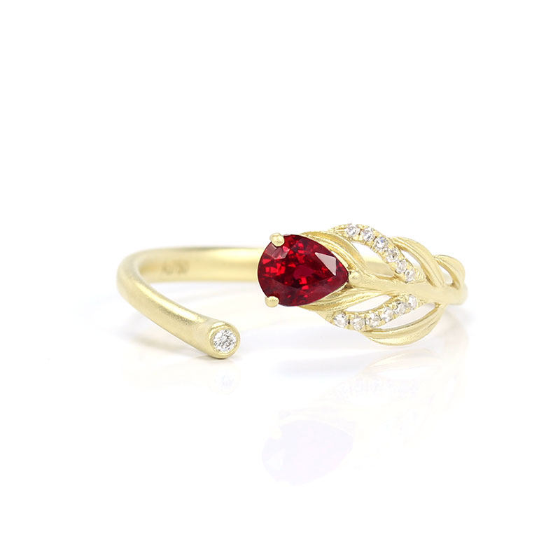 18K黄金天然鸽血红宝石水滴活口戒指 高火彩钻石开口磨砂羽毛指环