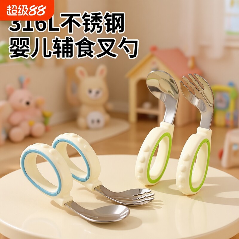 宝宝自主进食辅食勺子316L不锈钢婴儿元宝叉学吃饭训练儿童专用