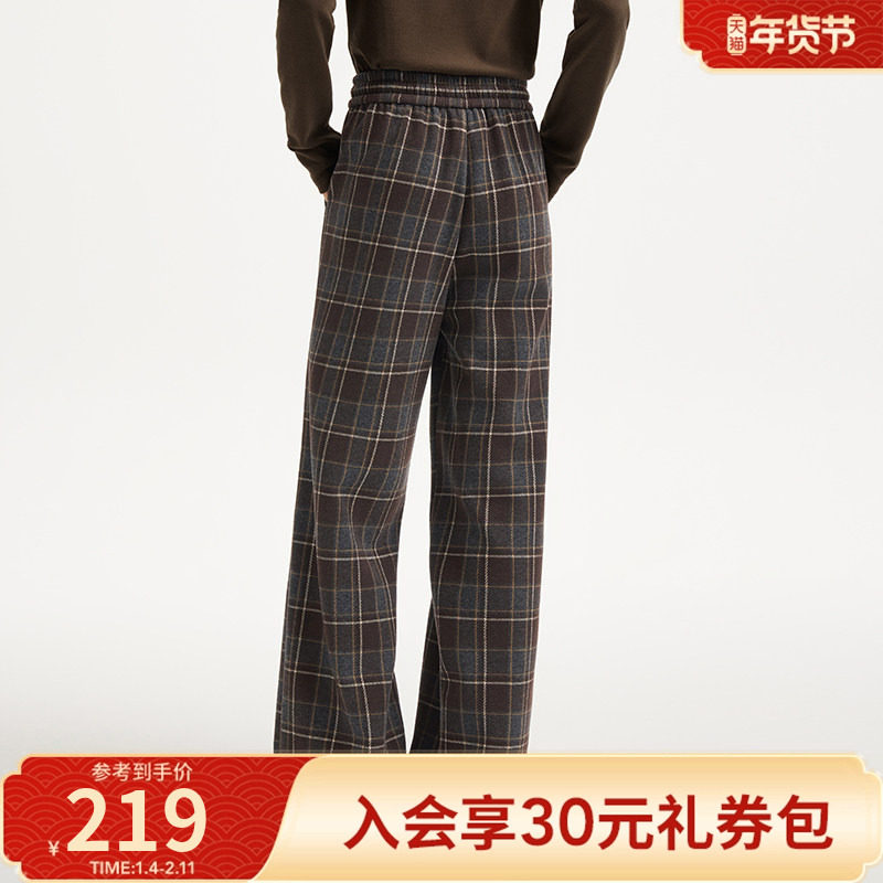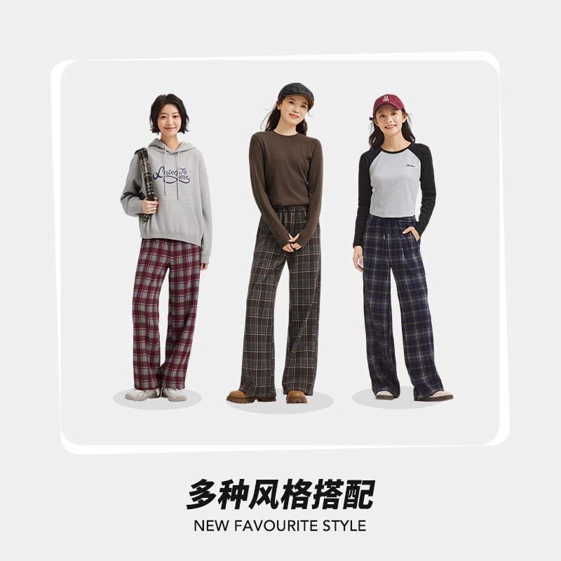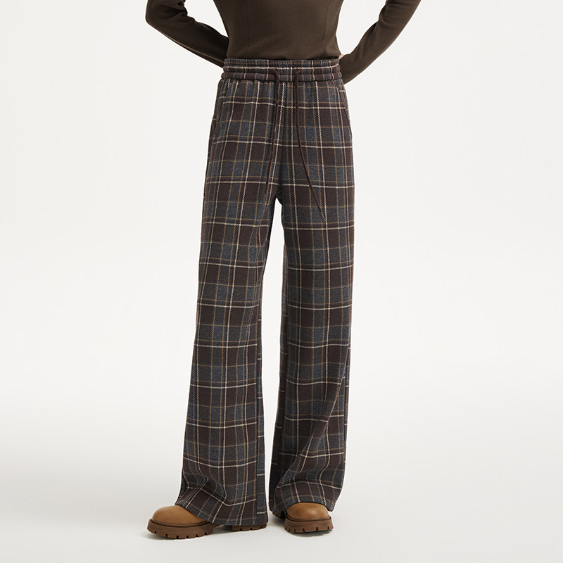 热风2025年冬季新款女士复古加绒格纹直筒裤微绒内里长裤