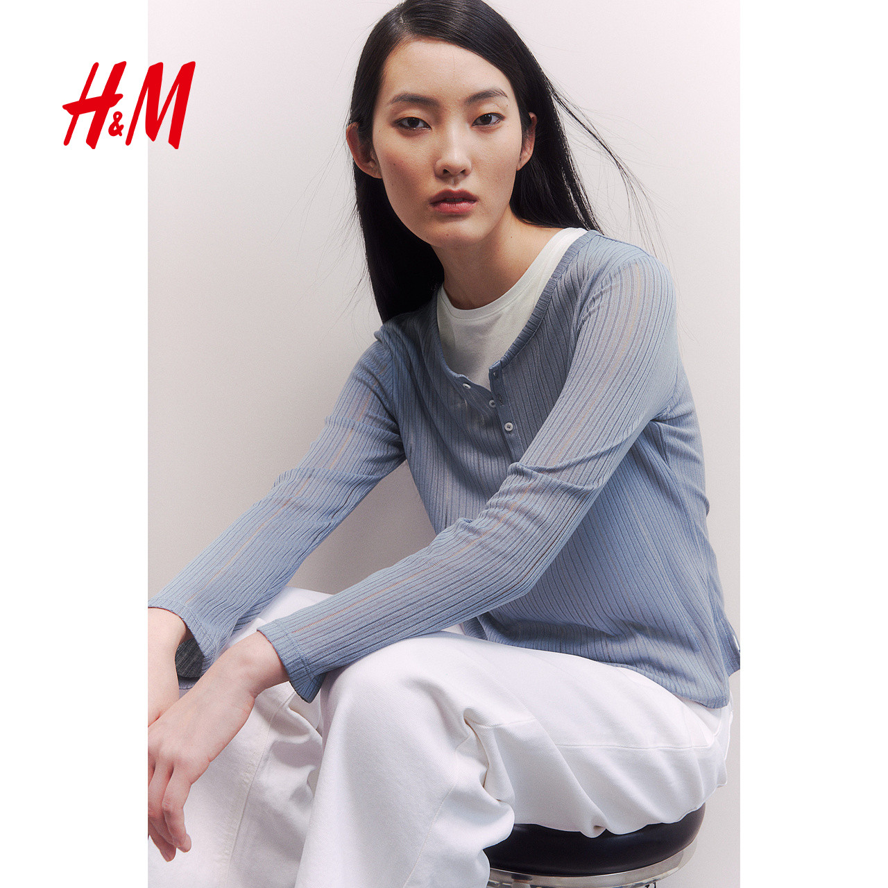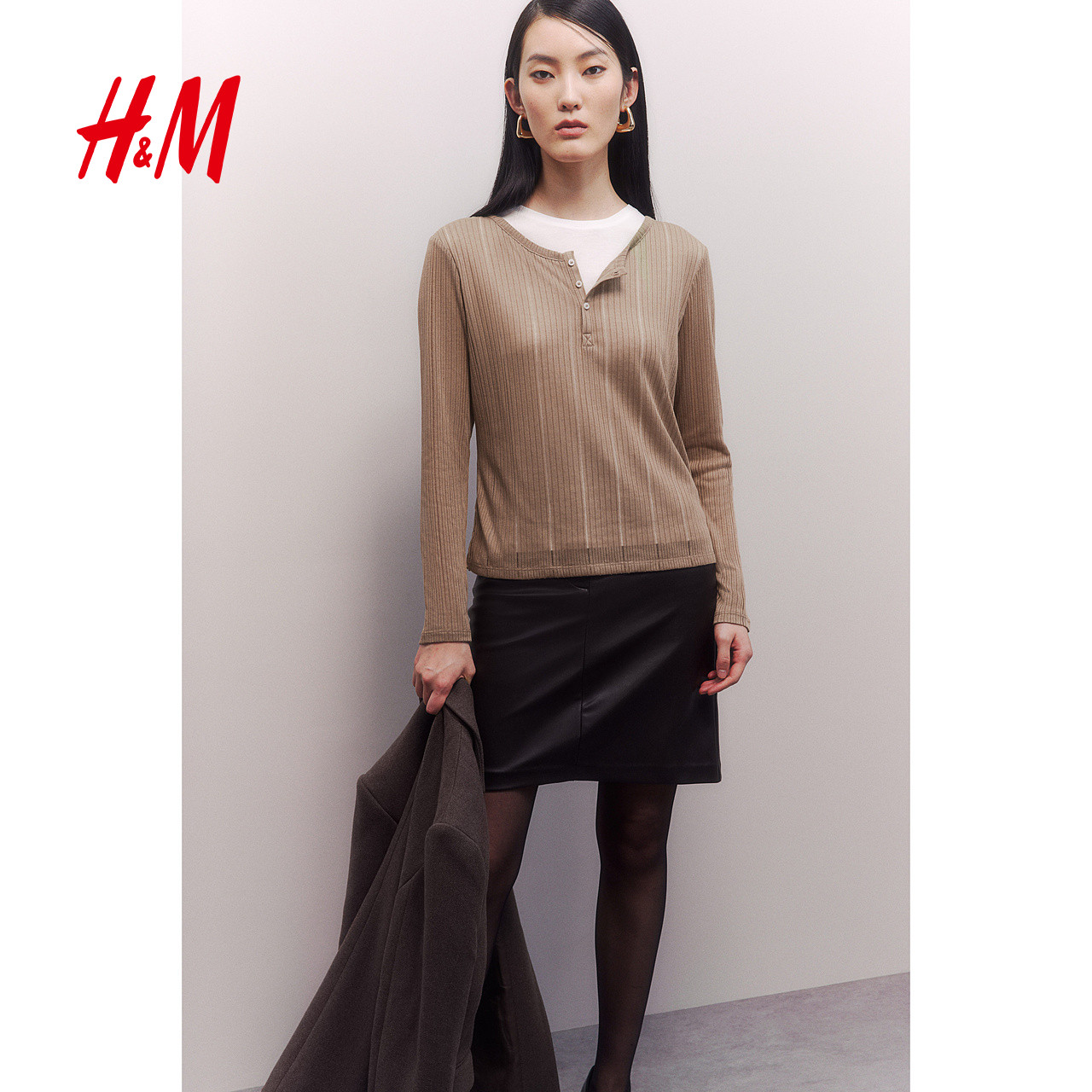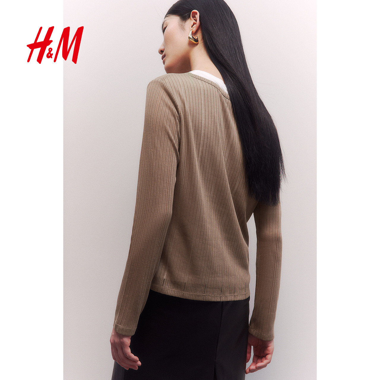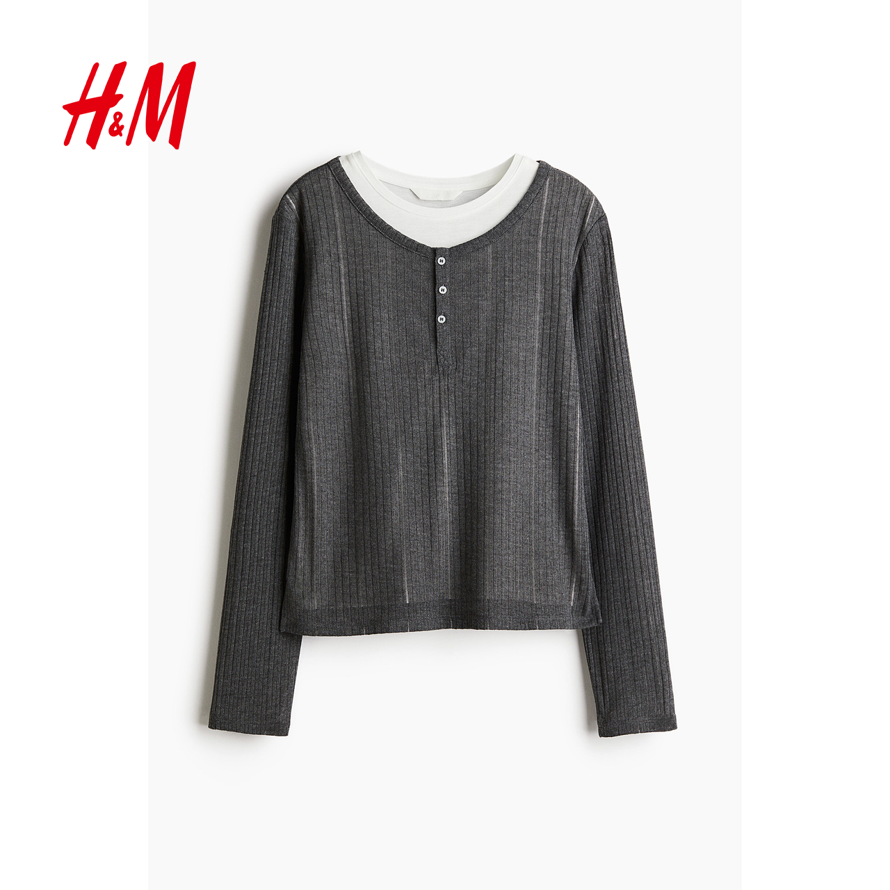 HM女装T恤2025冬季新款圆领修身气质休闲双层长袖打底上衣1281863