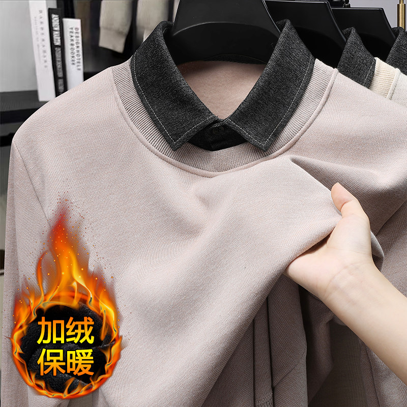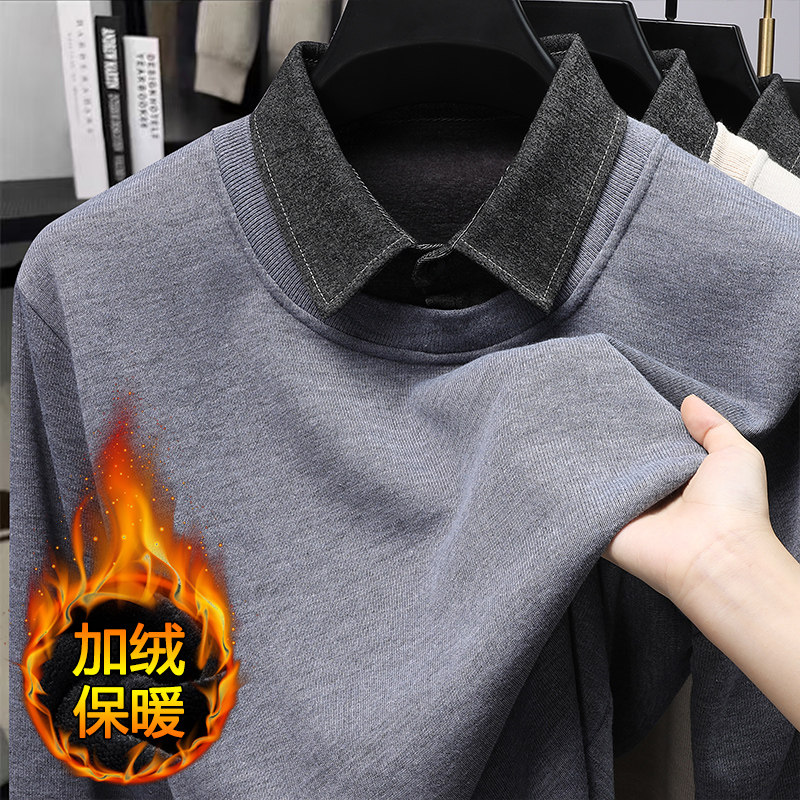 2025新款假两件衬衫领毛衣秋冬季爸爸装加绒加厚翻领保暖针织衫