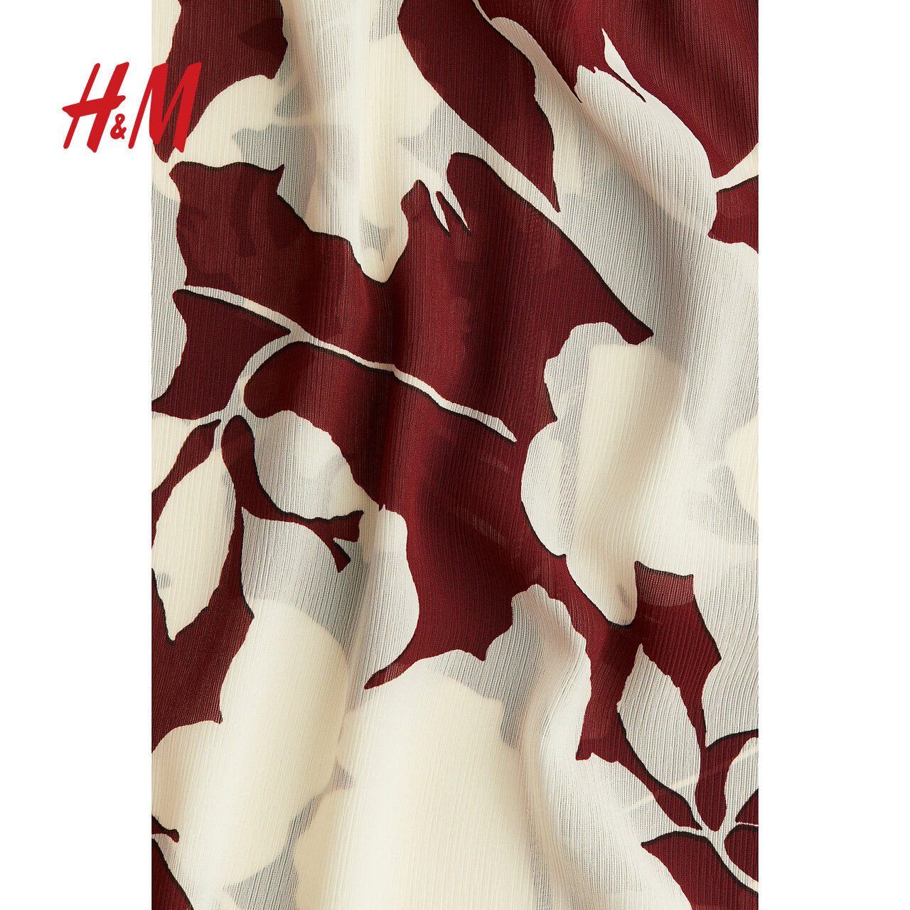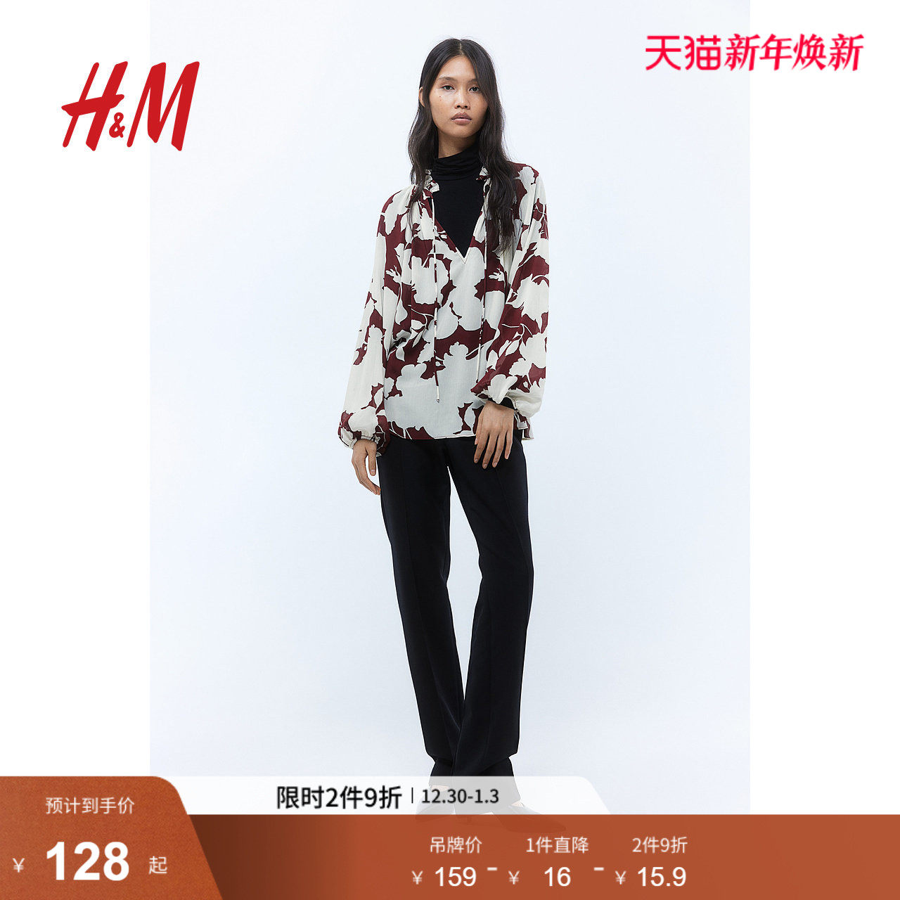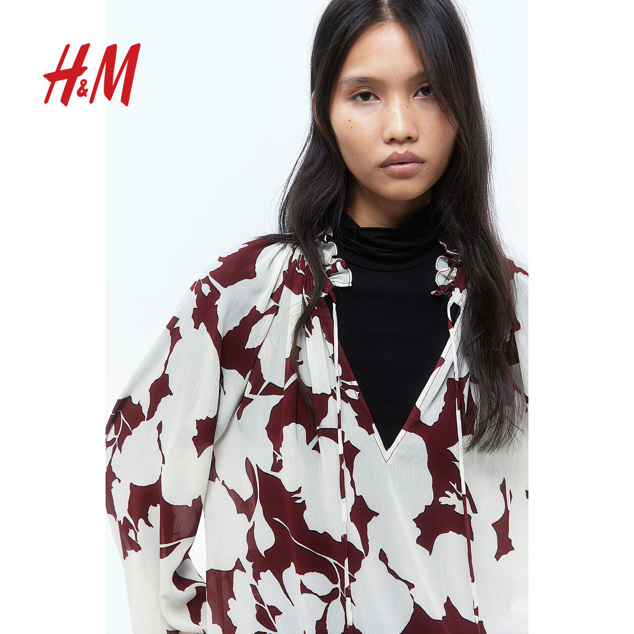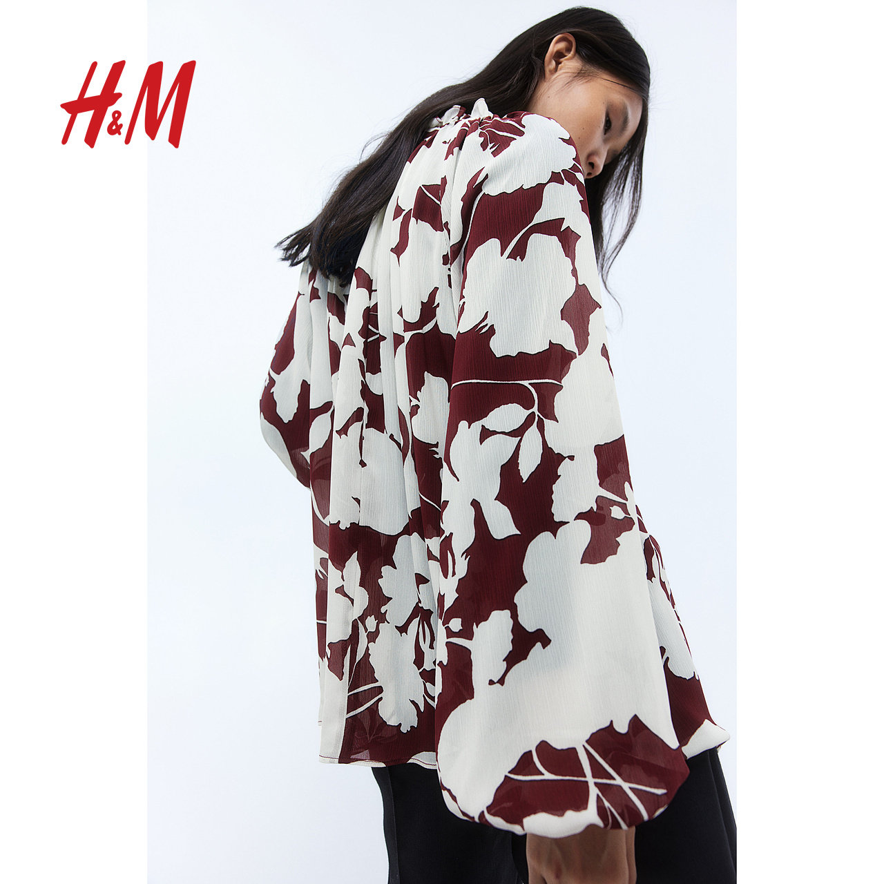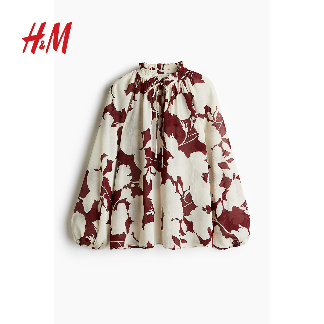 HM女装红色衬衫冬季时尚休闲宽松皱感雪纺上衣1264845