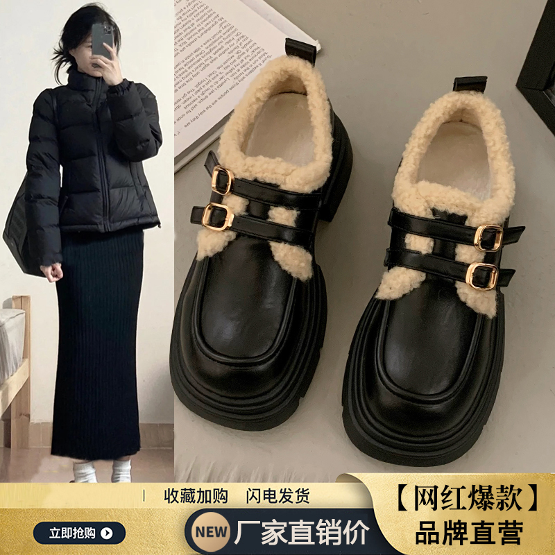 厚底乐福鞋女2025新款秋冬加绒单鞋子百搭毛毛棉鞋增高黑色小皮鞋