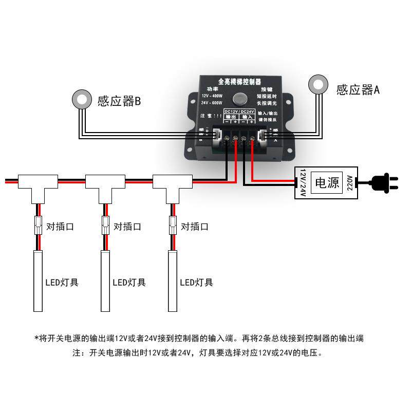 全亮楼梯控制器踏步灯12V24V大功率台阶人体感应免布线灯带控制器