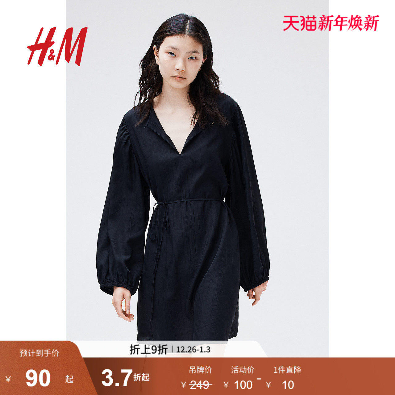 HM女装裙子冬季时尚休闲舒适圆领腰部系带连衣裙1225725