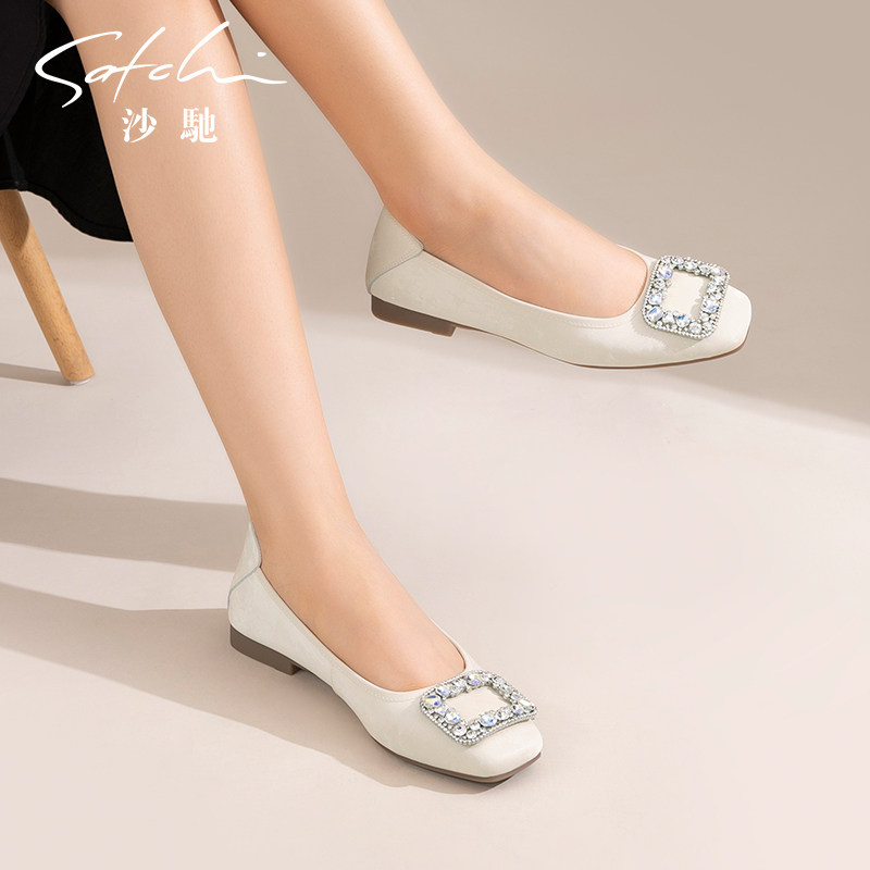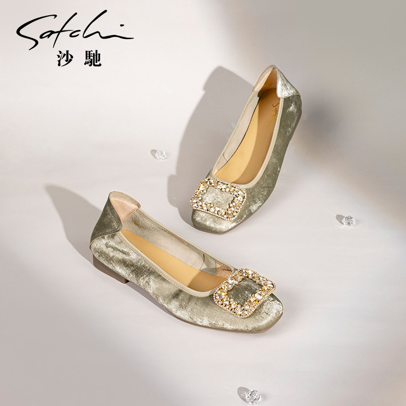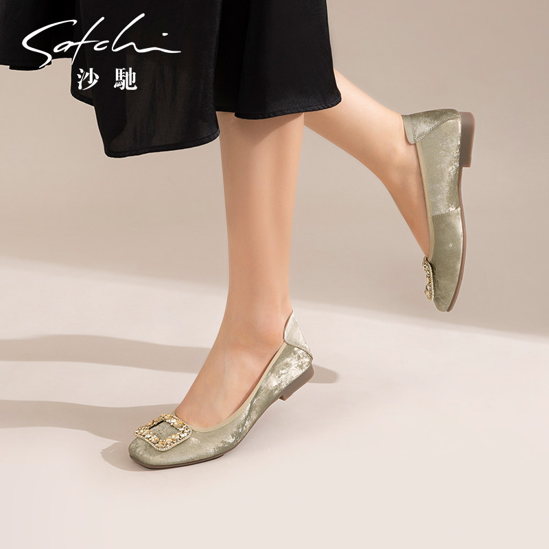 沙驰女鞋气质国风浅口单鞋春秋季新款闪钻方扣通勤鞋软底蛋卷鞋子
