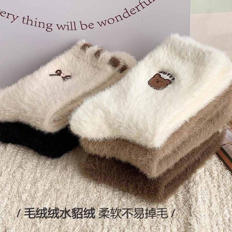 水貂绒袜子女秋冬季卡通毛绒保暖中筒袜加绒加厚冬天居家长袜黑色