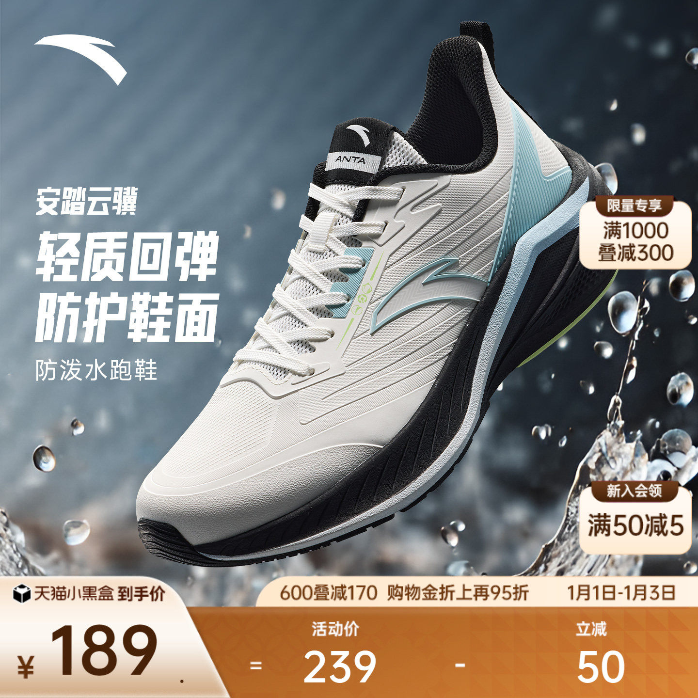 安踏云骥丨革面防泼水户外跑步鞋男冬季轻质舒适回弹运动鞋跑鞋