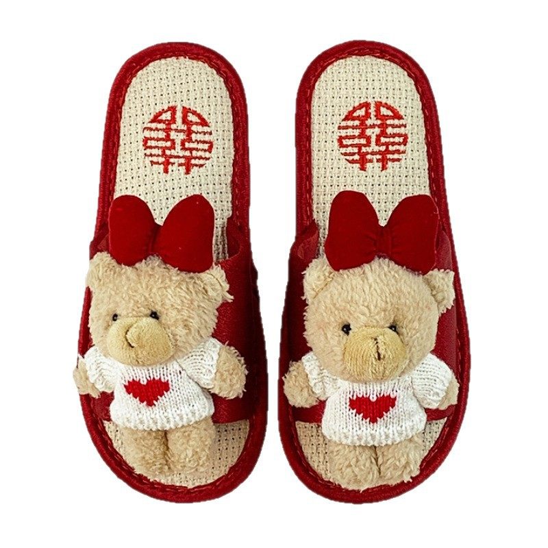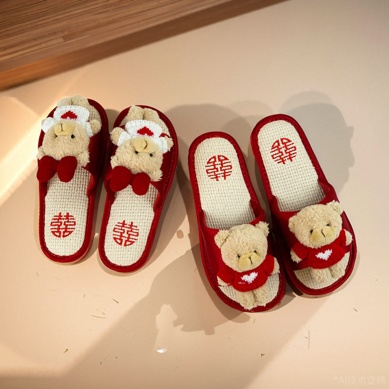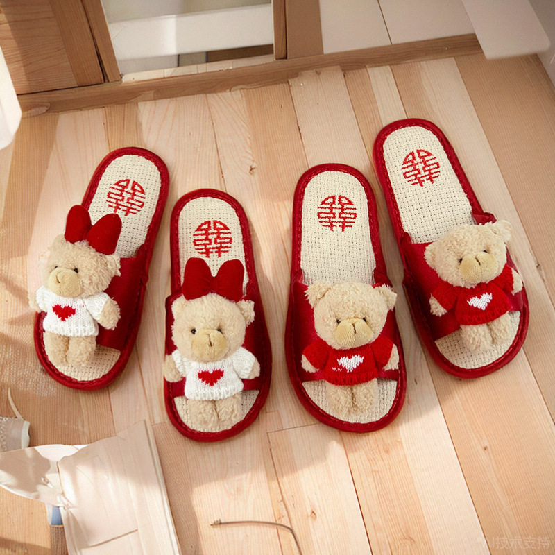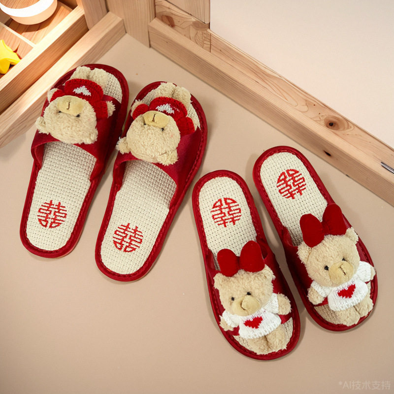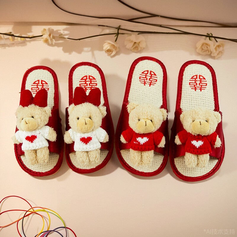 结婚拖鞋可爱婚庆礼物家居亚麻室内防滑大红一对厂家直销一件代发