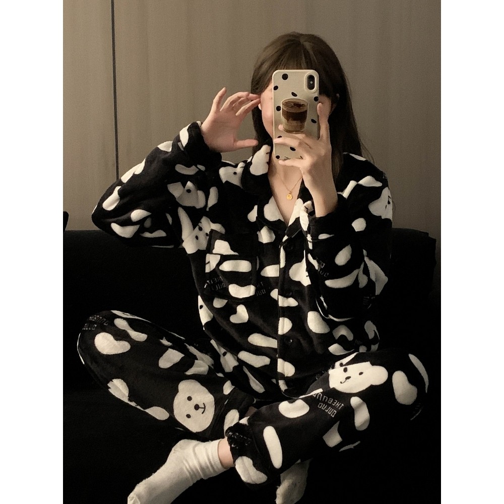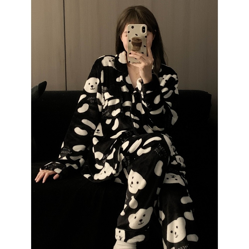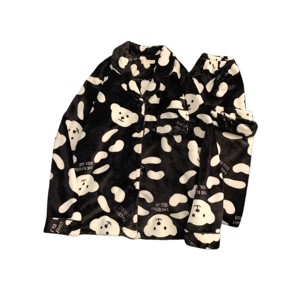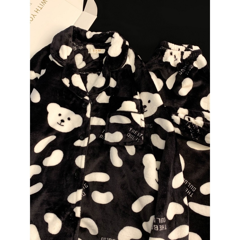 红豆韩版情侣睡衣女卡通高级黑色小熊冬季珊瑚绒加厚法兰绒家居服