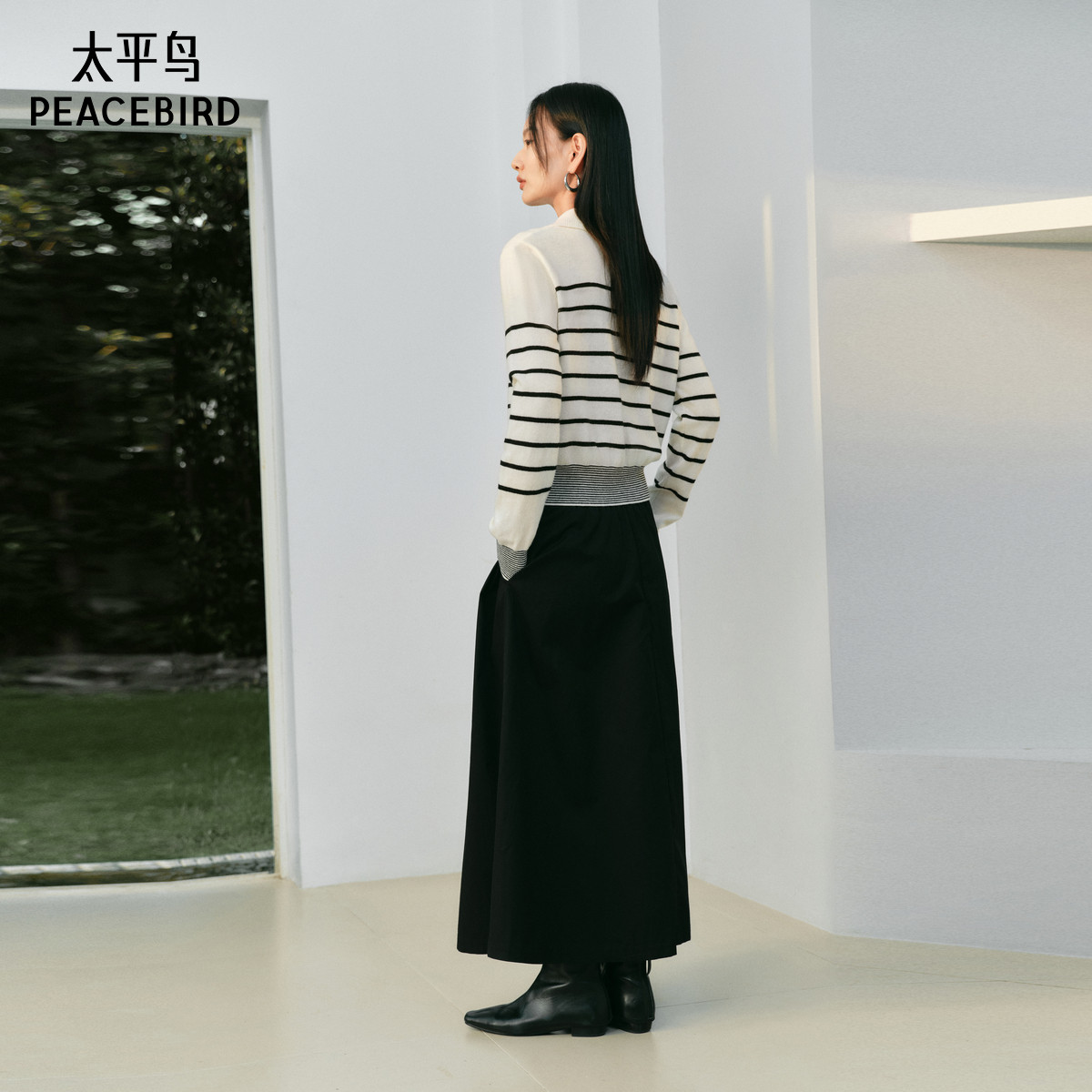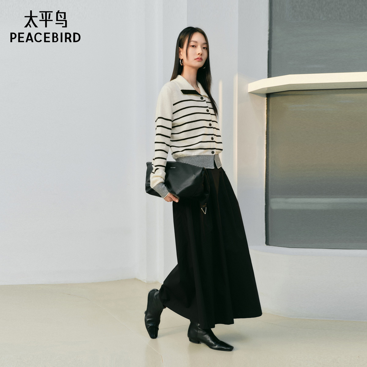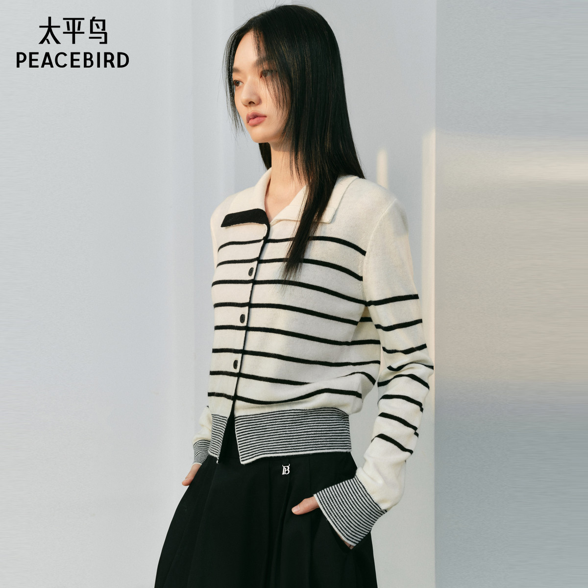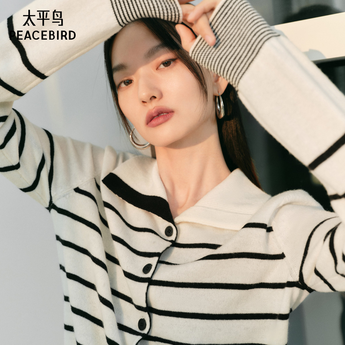太平鸟 翻领撞色条纹针织衫25年女士通勤内搭羊毛混纺开衫外套