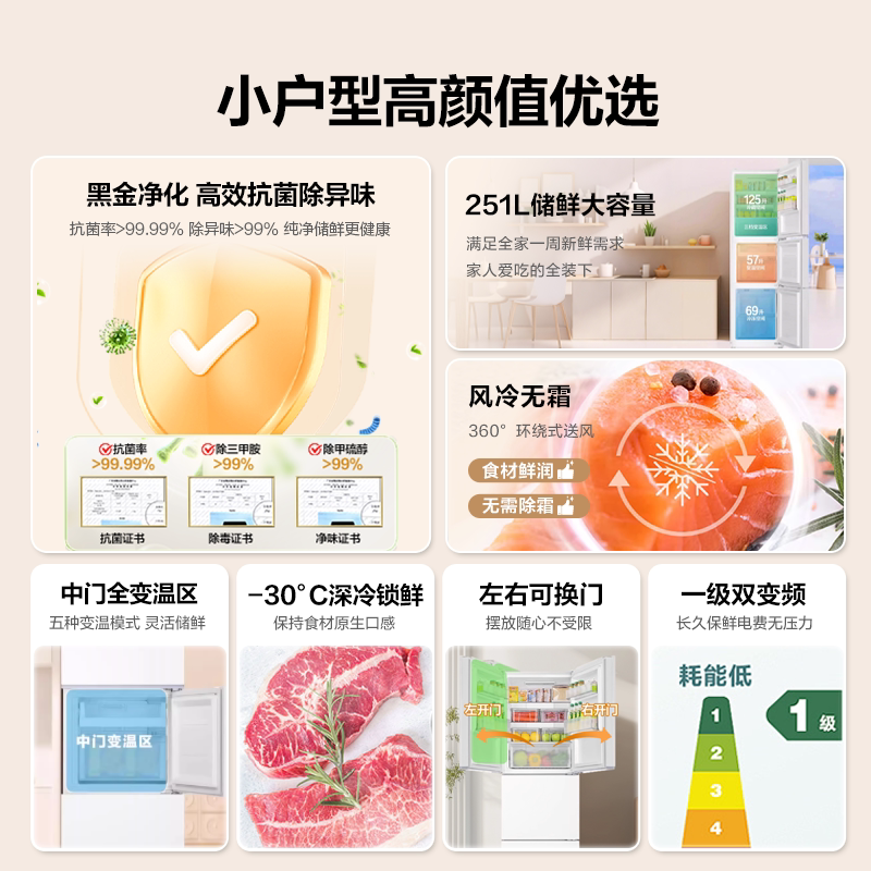 海尔冰箱251升三开门一级能效风冷无霜变频节能小型家用官方正品