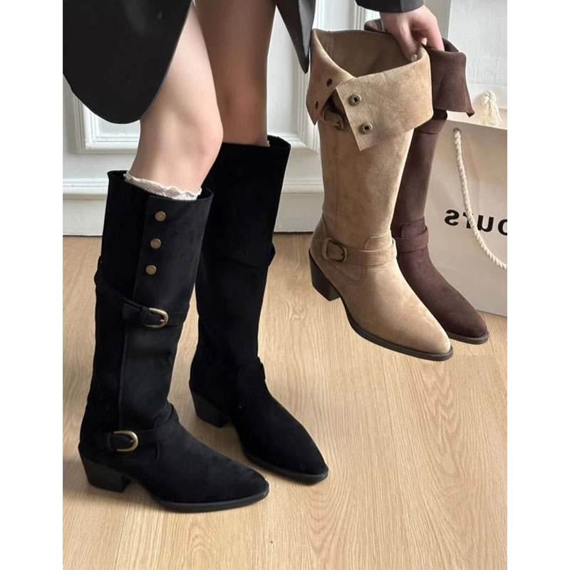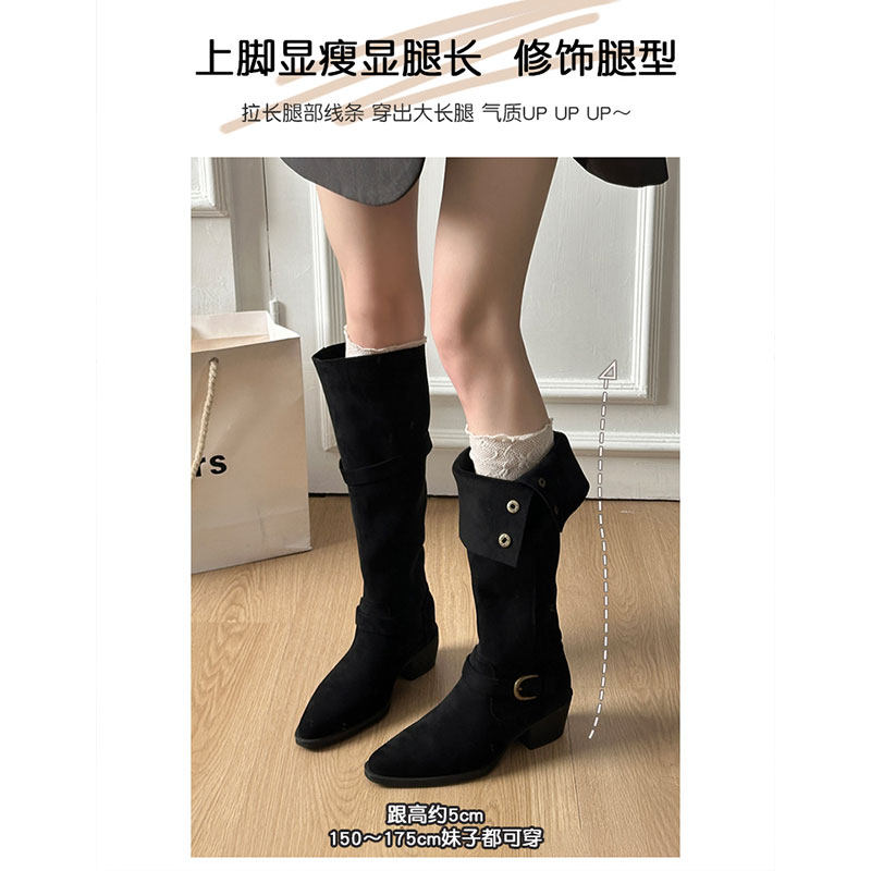 粗跟骑士靴女2025秋季增高长靴两穿靴子卡其色尖头绒面黑色毛绒