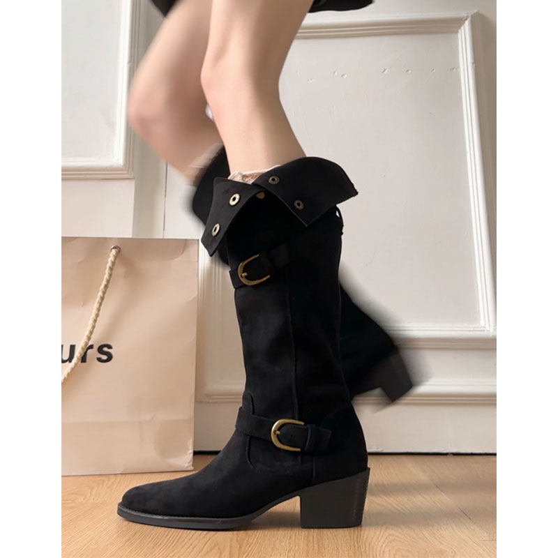 真皮~骄屿复古皮带扣粗跟长筒靴不过膝显瘦骑士靴尖头褶皱堆堆靴