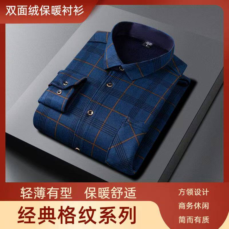 加绒加厚格子衬衫男长袖休闲保暖衬衣爸爸装印花上衣免烫全棉衬衣