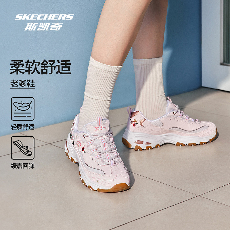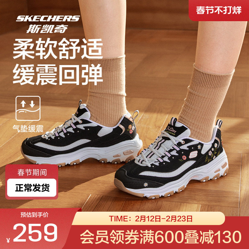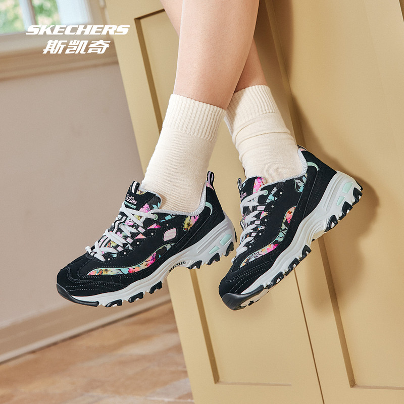 斯凯奇官方outlets小白鞋女子刺绣印花运动鞋厚底增高黑白老爹鞋