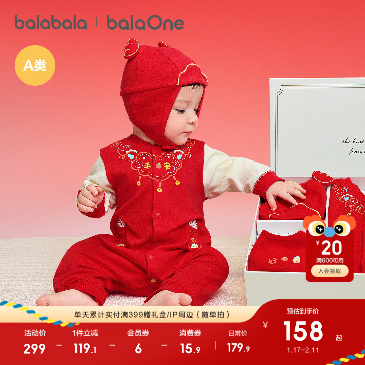 巴拉巴拉新生儿礼盒宝宝满月用品大全六件装新年礼盒初红色拜年服