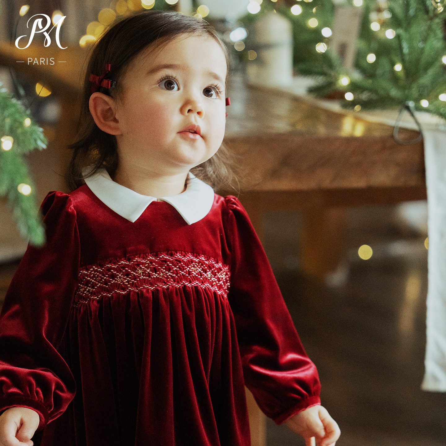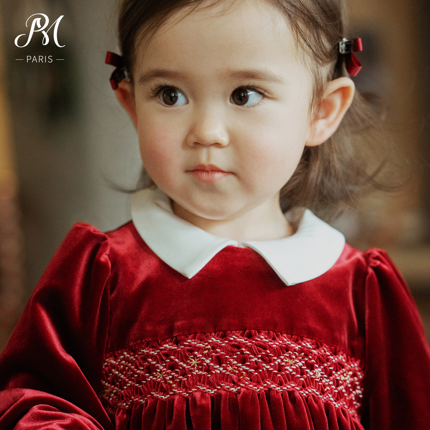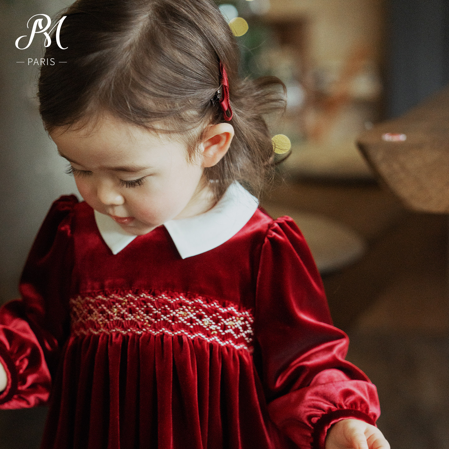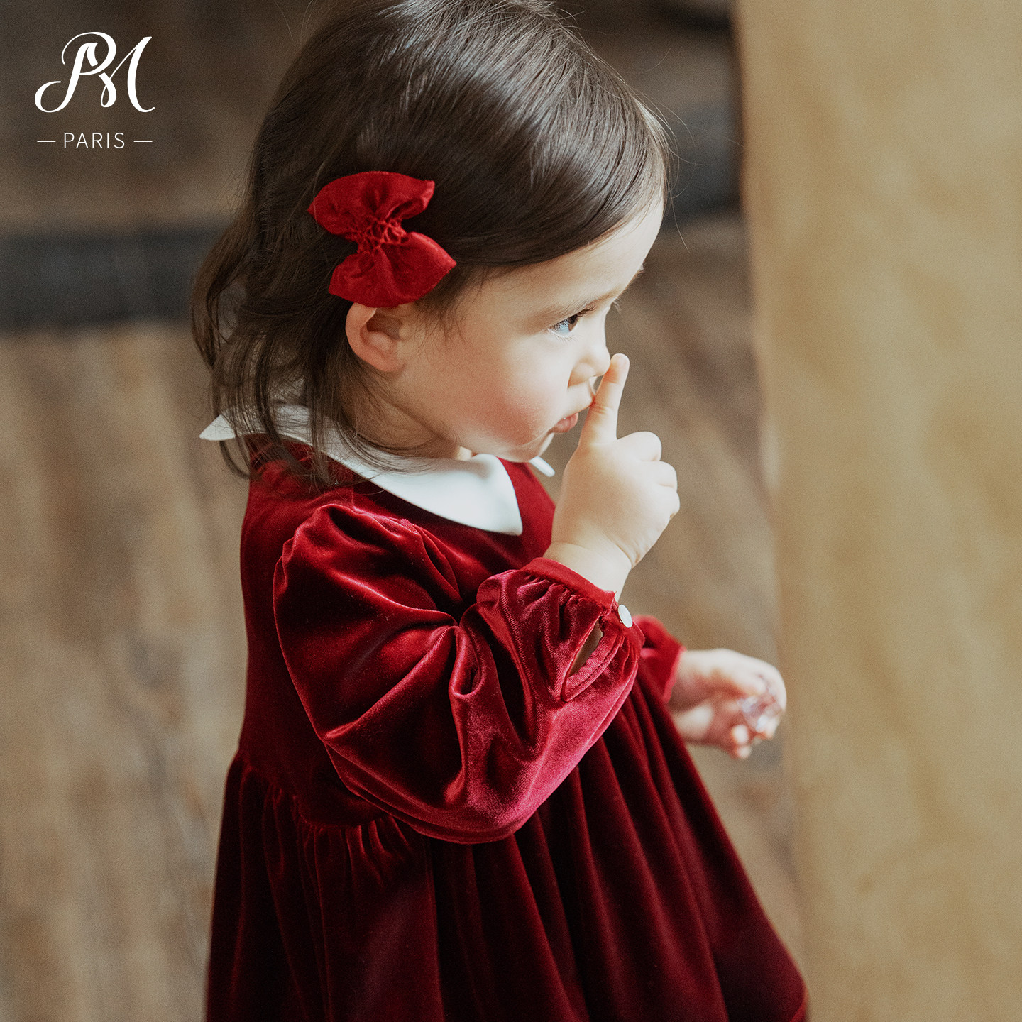 Petite Marguerite小雏菊婴童·手工缩褶绣红色丝绒娃娃领连衣裙