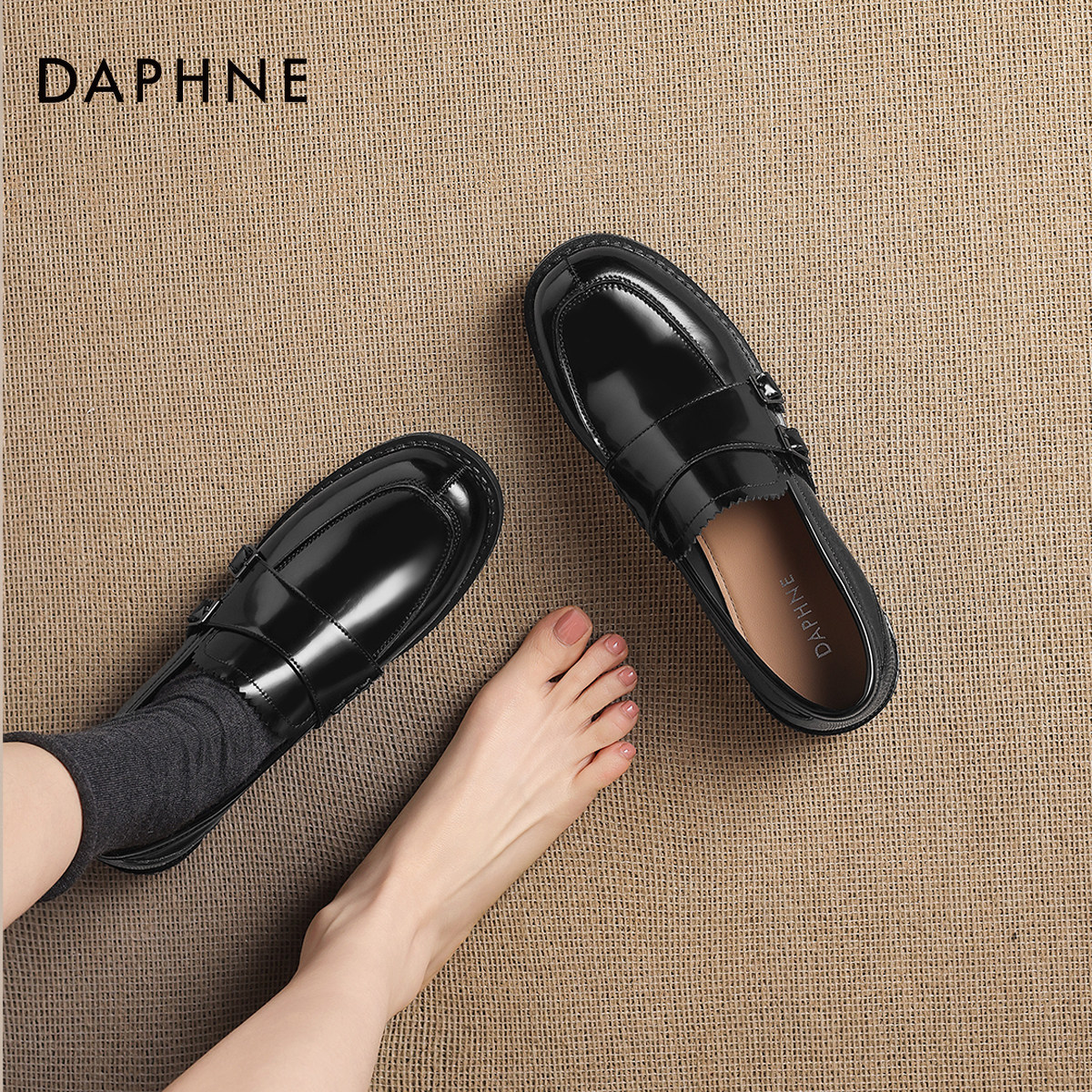 达芙妮乐福鞋女款2026新款黑色平底单鞋学院英伦风布洛克小皮鞋女