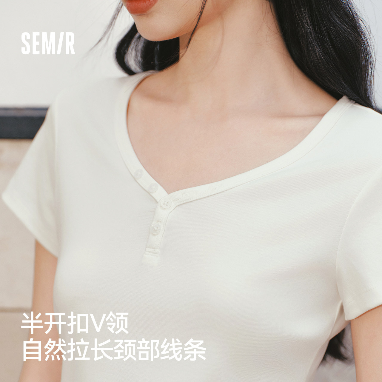 森马短袖T恤女夏季短款V领半开襟套头衫紧身纯色正肩2026新款上衣