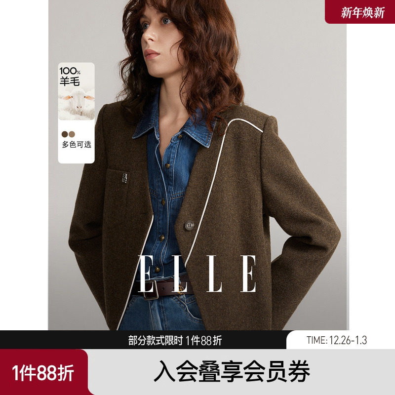 ELLE绵羊毛线条感单面呢大衣女2025冬装新款小个子通勤毛呢外套