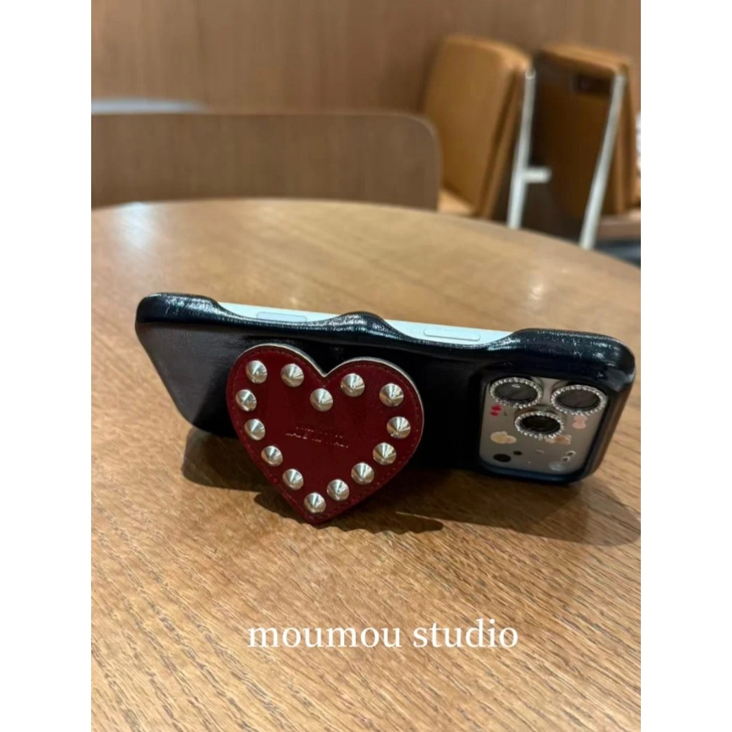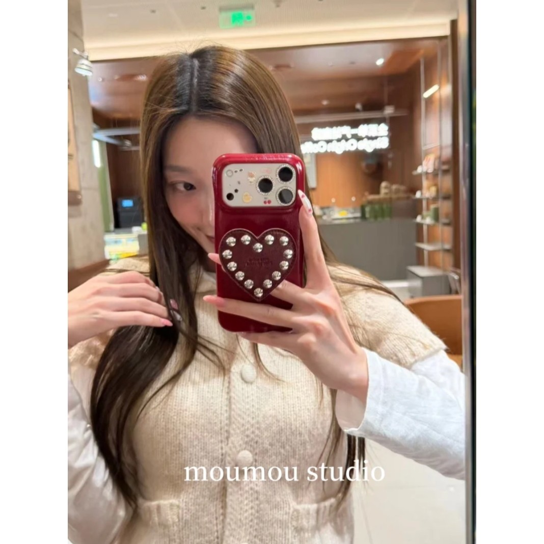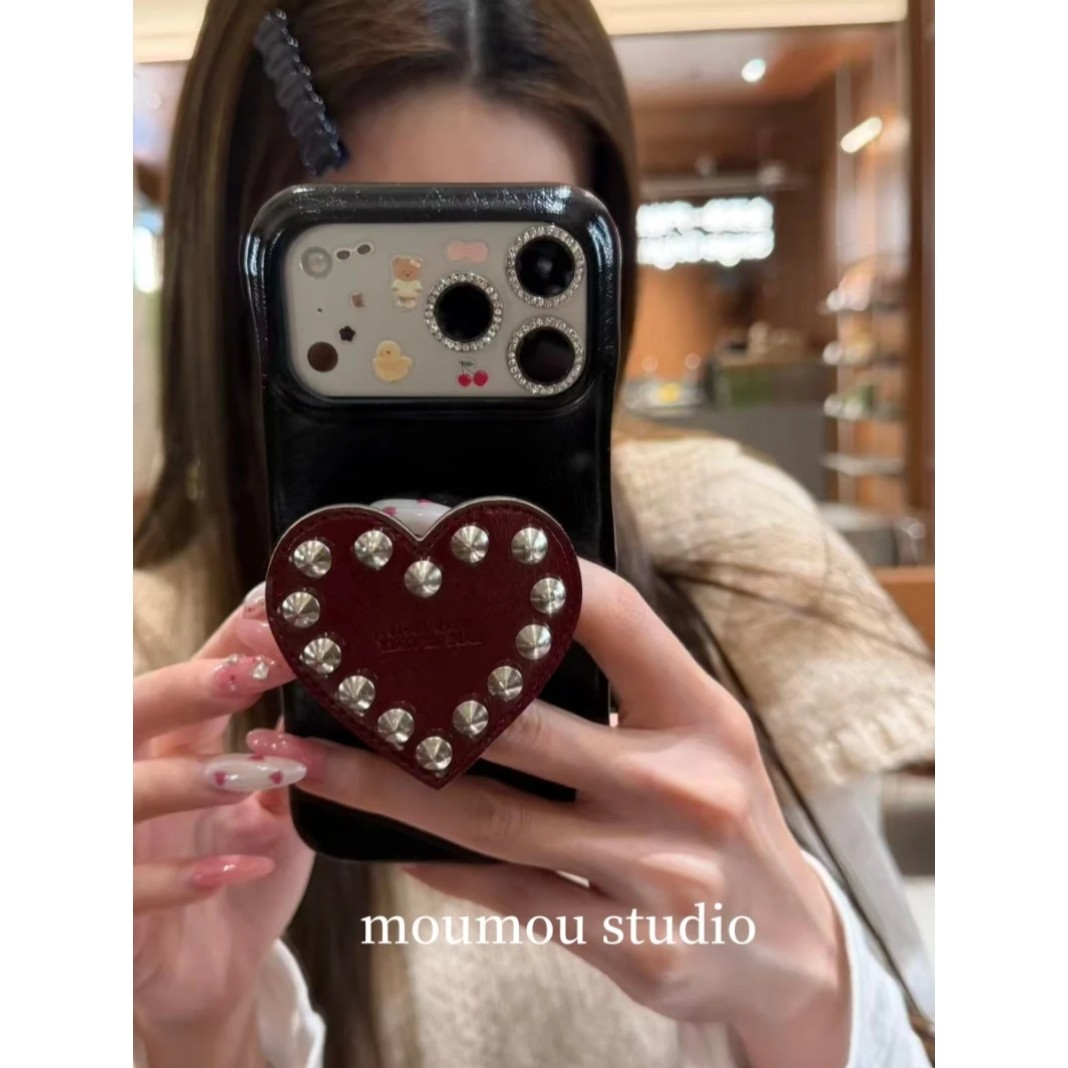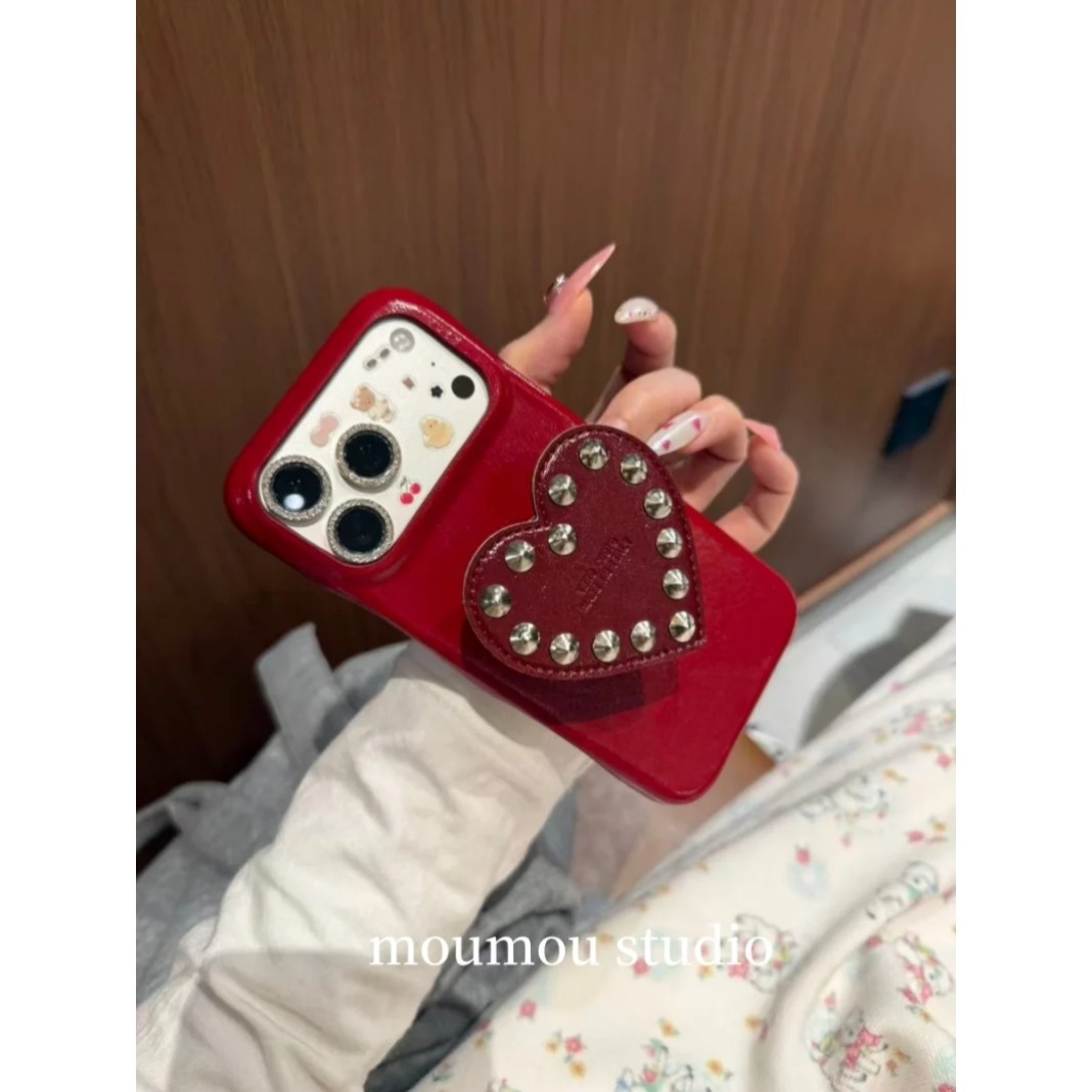 MOMOMOSTUDIOS小众ins酒红皮纹铆钉爱心支架适用iPhone17promax新款16pro苹果手机壳15pro全包14防摔13保护壳