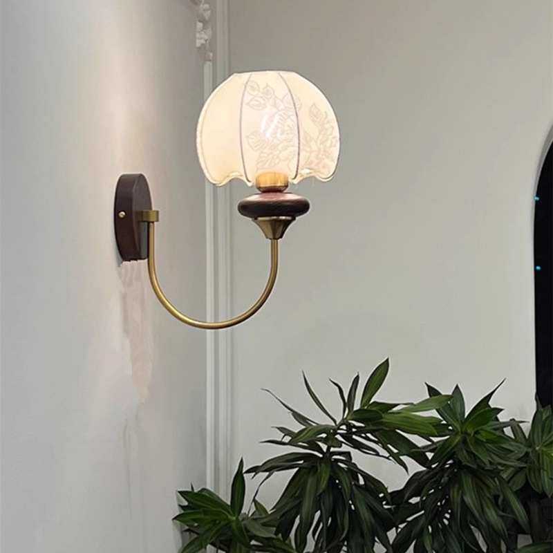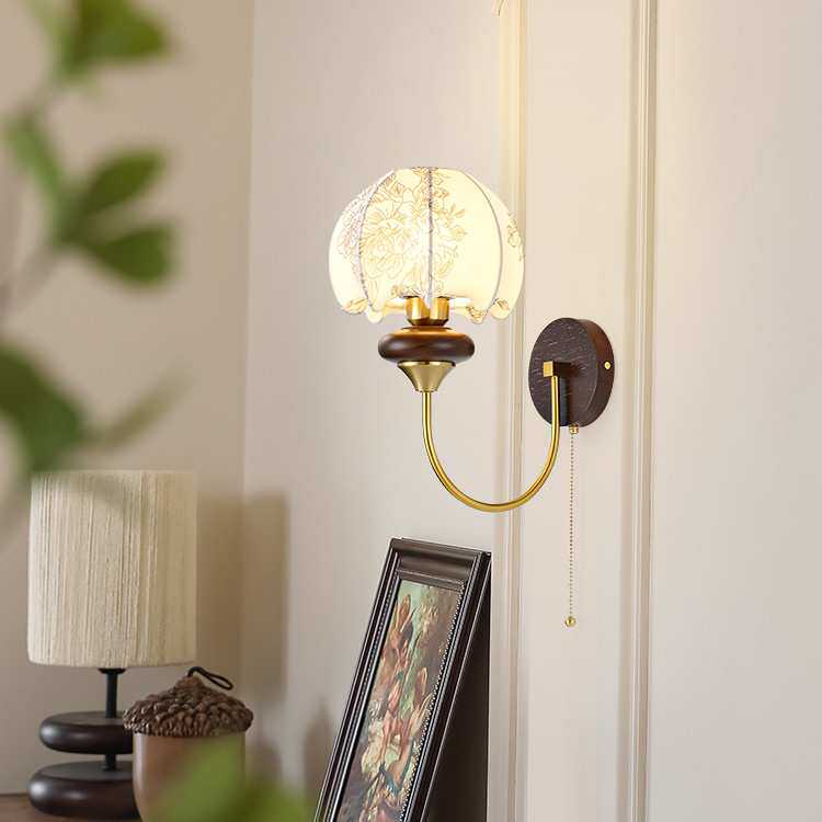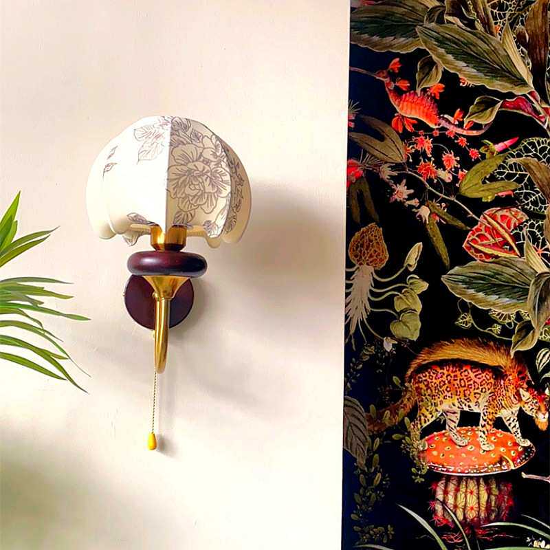 法式中古壁灯卧室床头灯美式复古花纹布艺客厅实木带拉线开关灯具