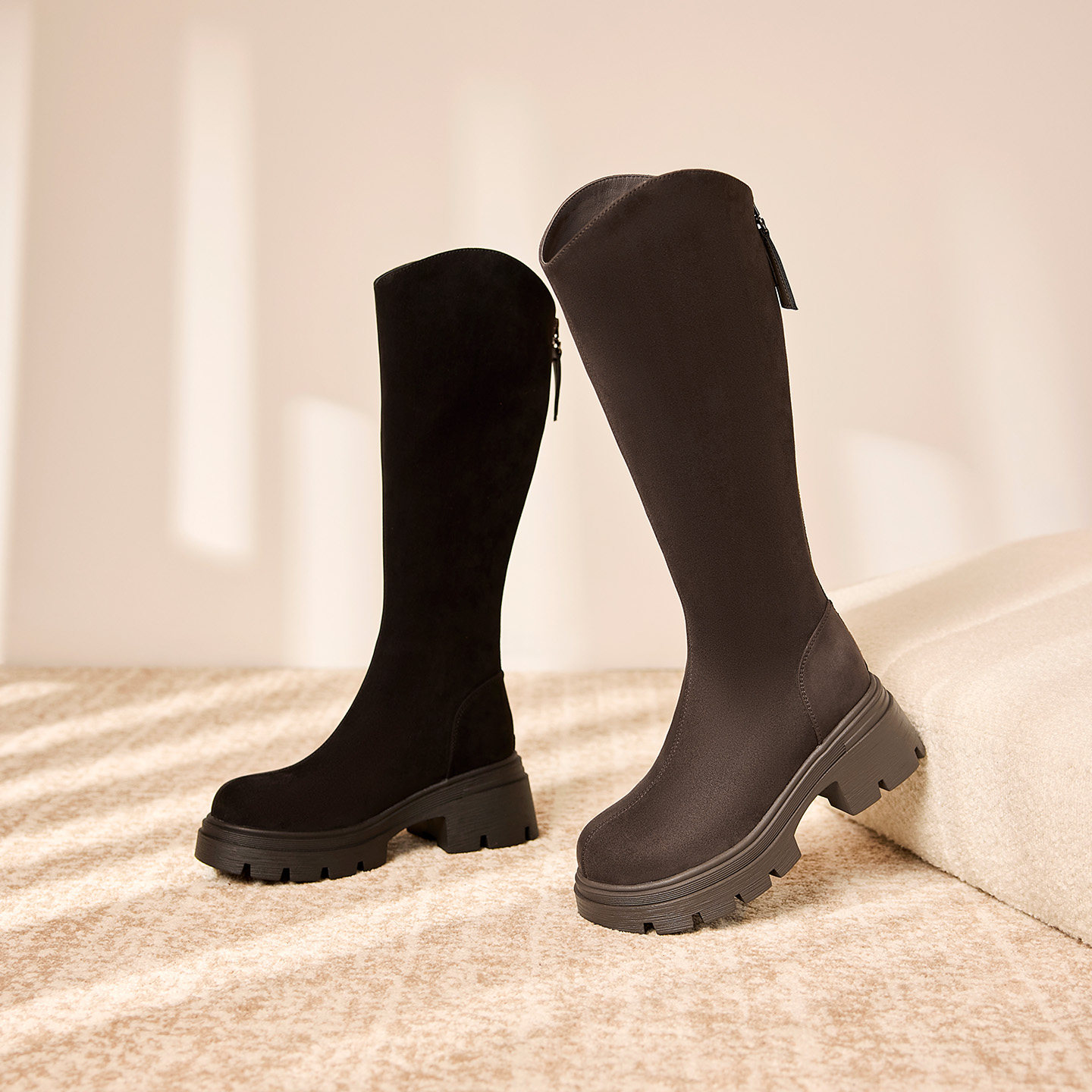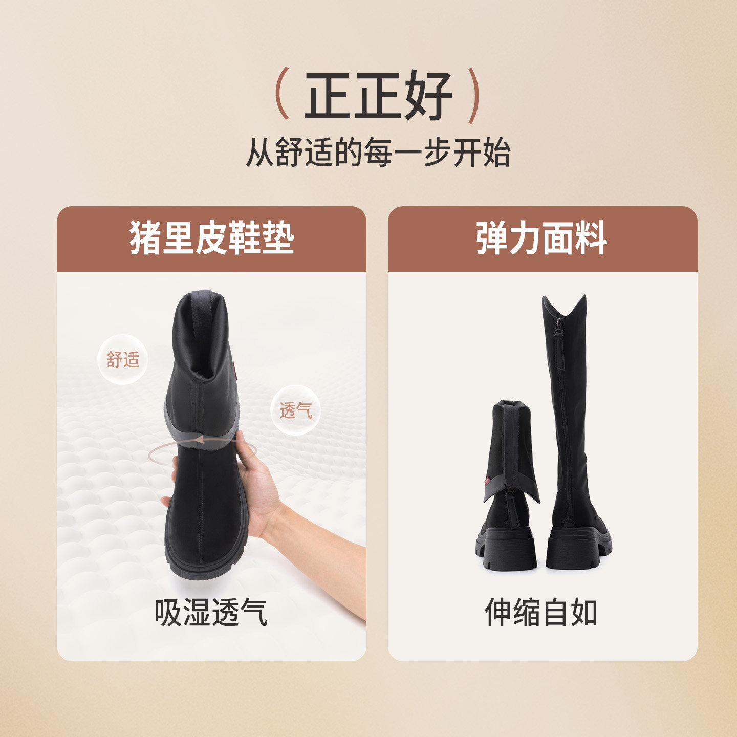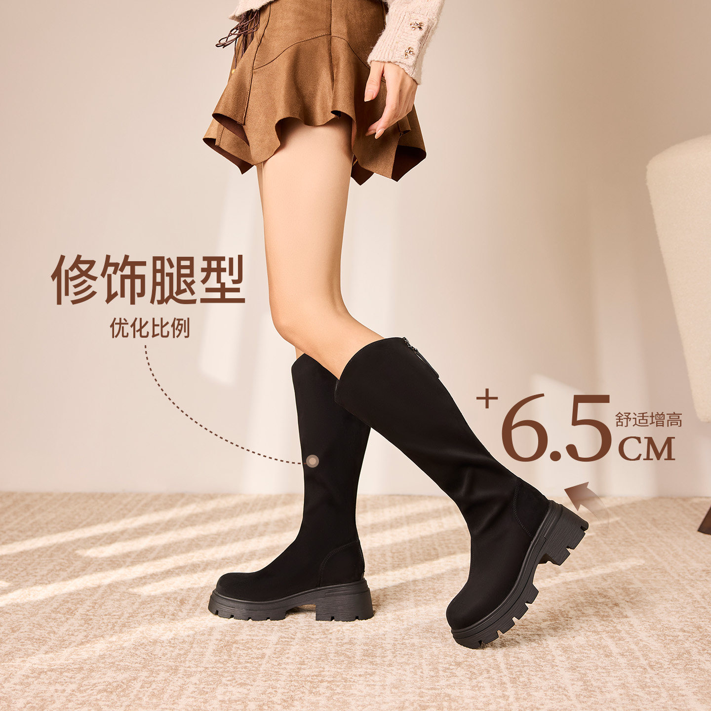 奥康 女鞋2025冬季弹力靴简约绒面骑士靴圆头瘦瘦靴厚底增高长靴