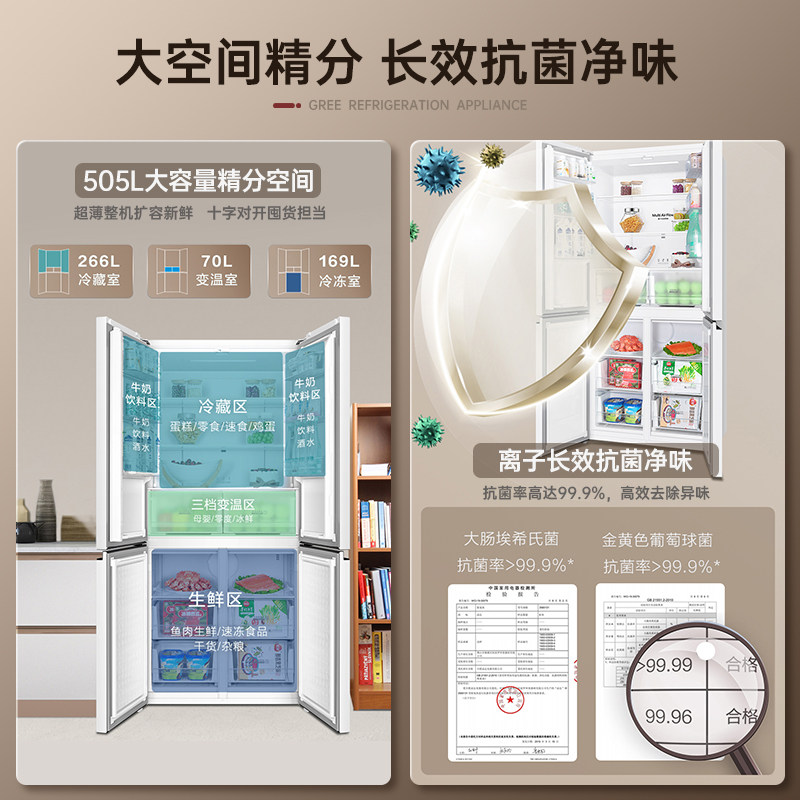 【60cm平嵌】格力荔枝雪立方505L十字门1级变频嵌入风冷无霜冰箱