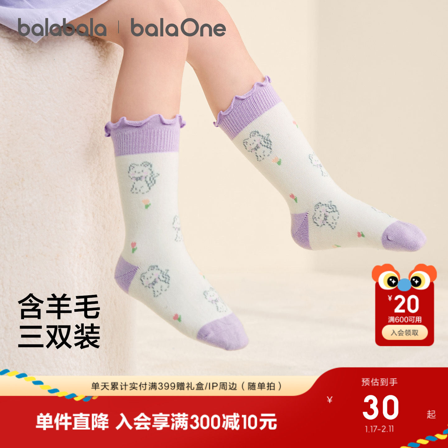 【balaOne】巴拉巴拉儿童袜子秋冬新女童袜子中大童含羊毛三双装