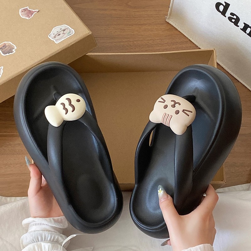 可爱海边沙滩夹趾鞋女百搭立体小猫咪EVA厚底学生通勤增高人字拖