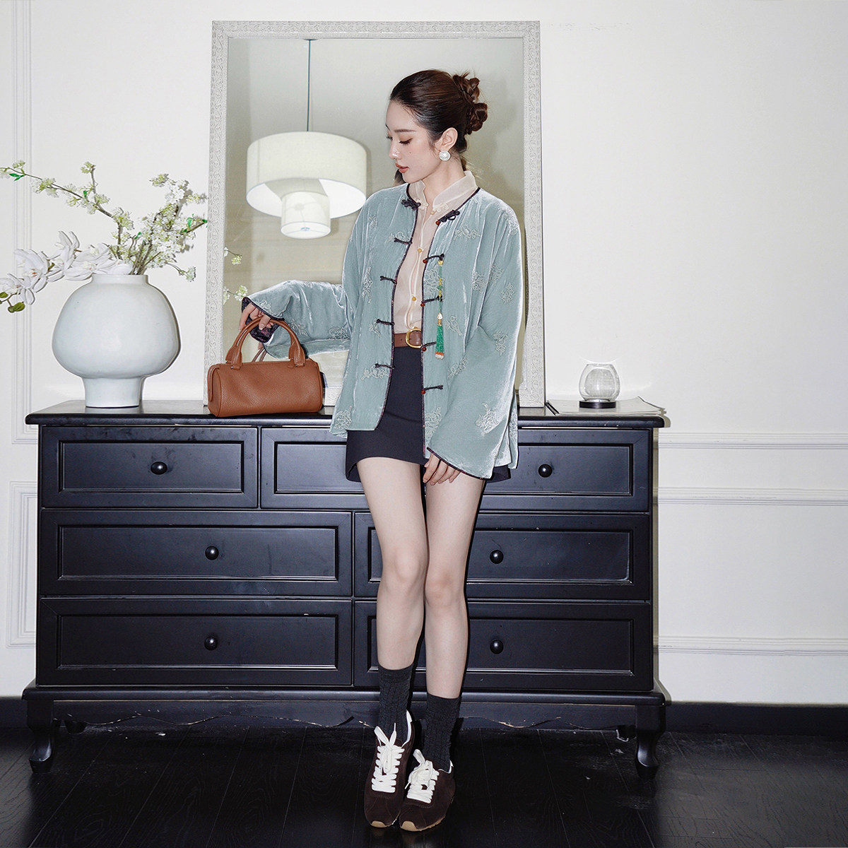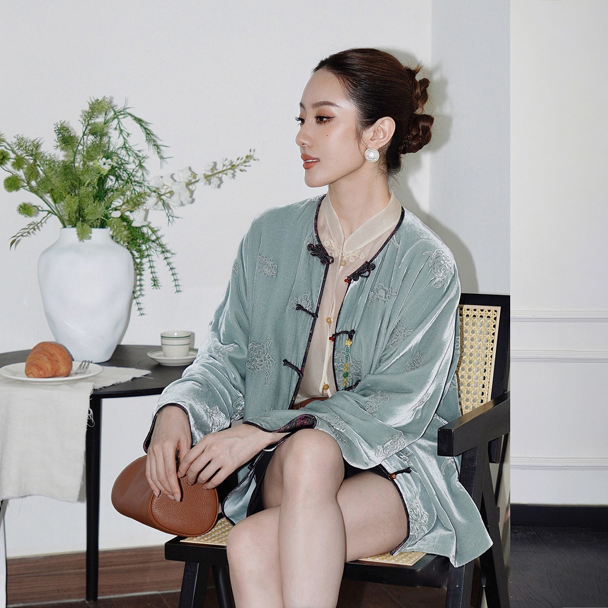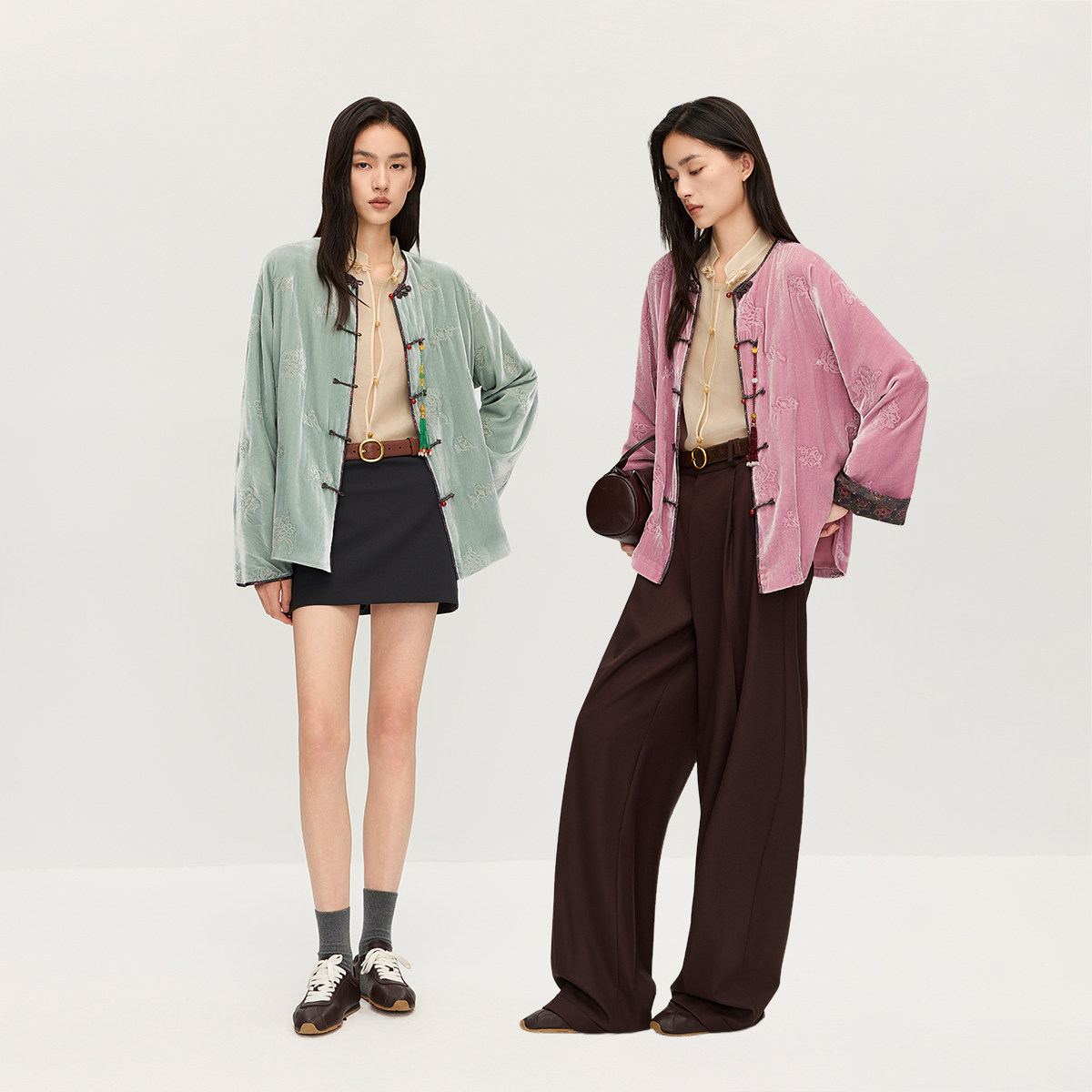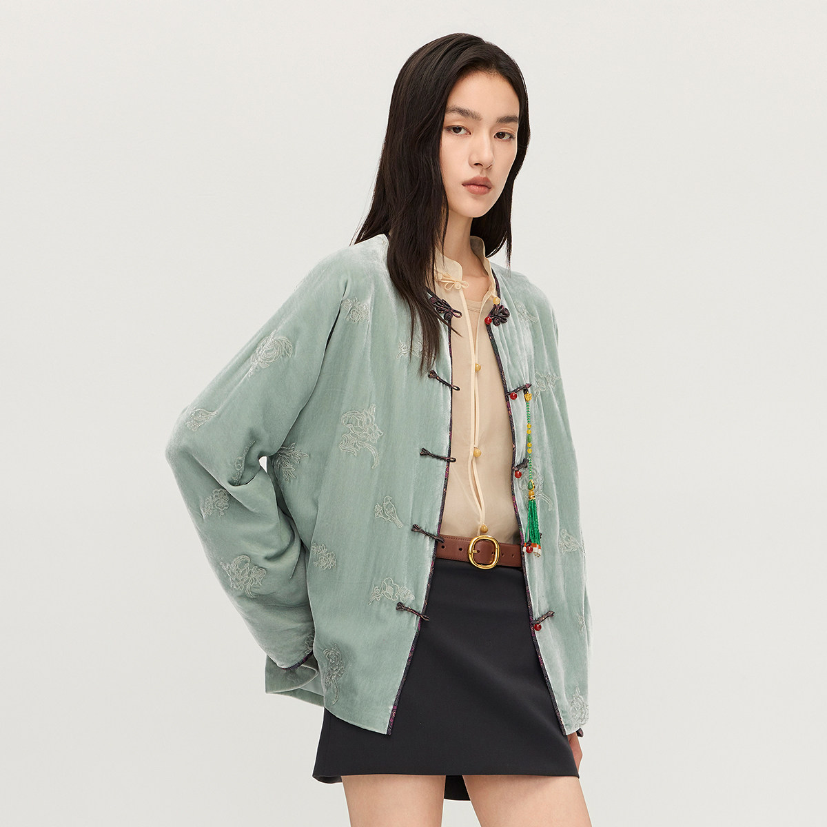 【新品】OCHIRLY欧时力真丝哑光丝绒刺绣新中式外套盘扣挂链25冬