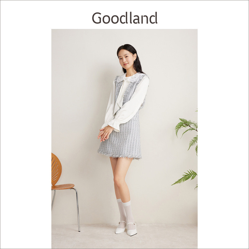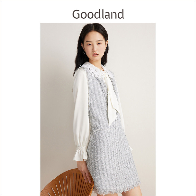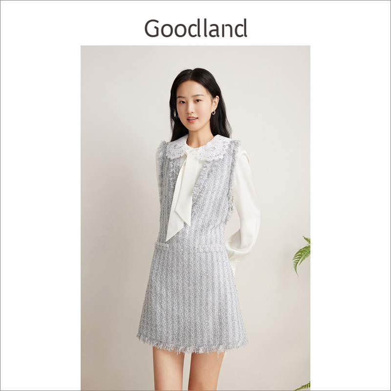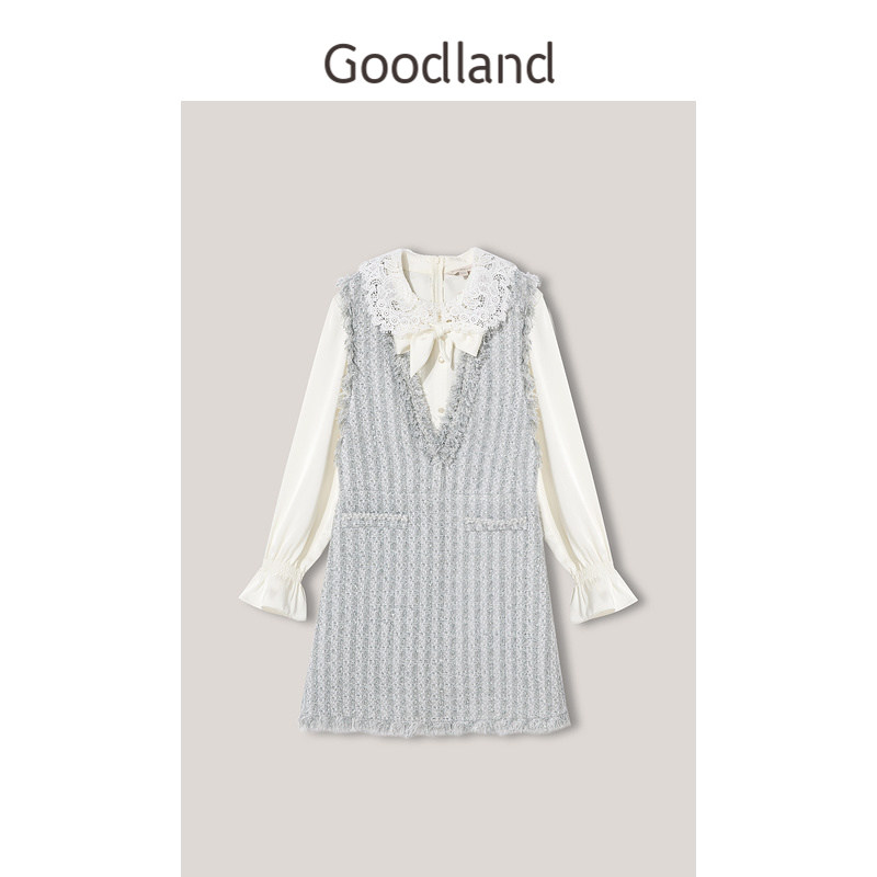 Goodland美地春季法式优雅双层大翻领蕾丝花纱背心连衣裙