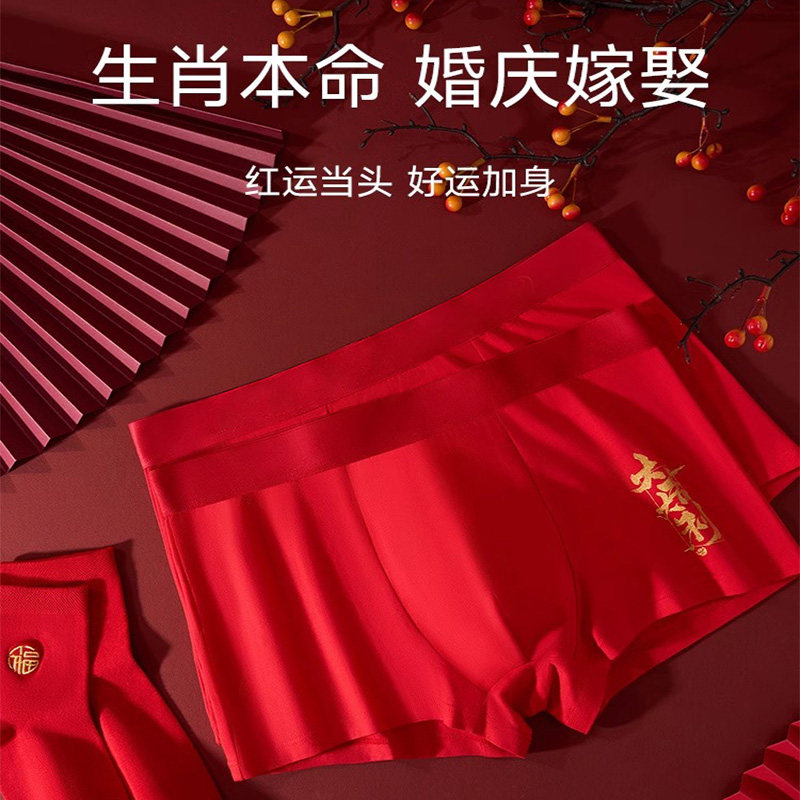 雅鹿本命年大红色男士内裤纯棉四角短裤结婚礼物男款红色平角裤头