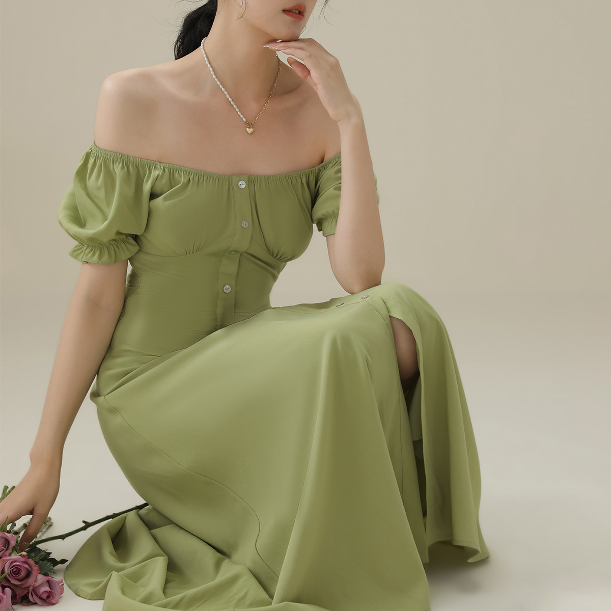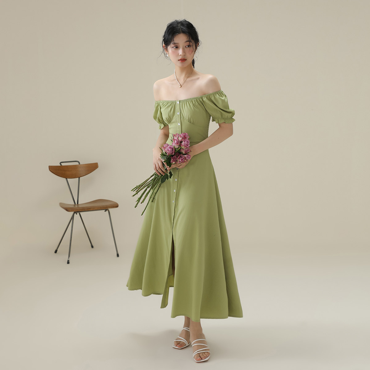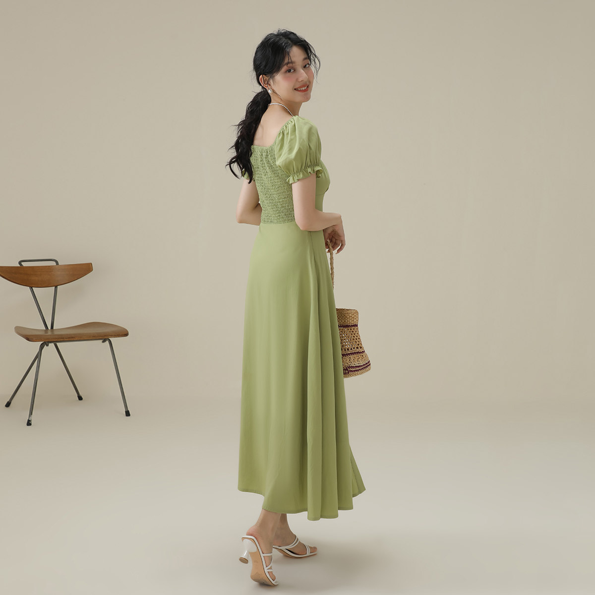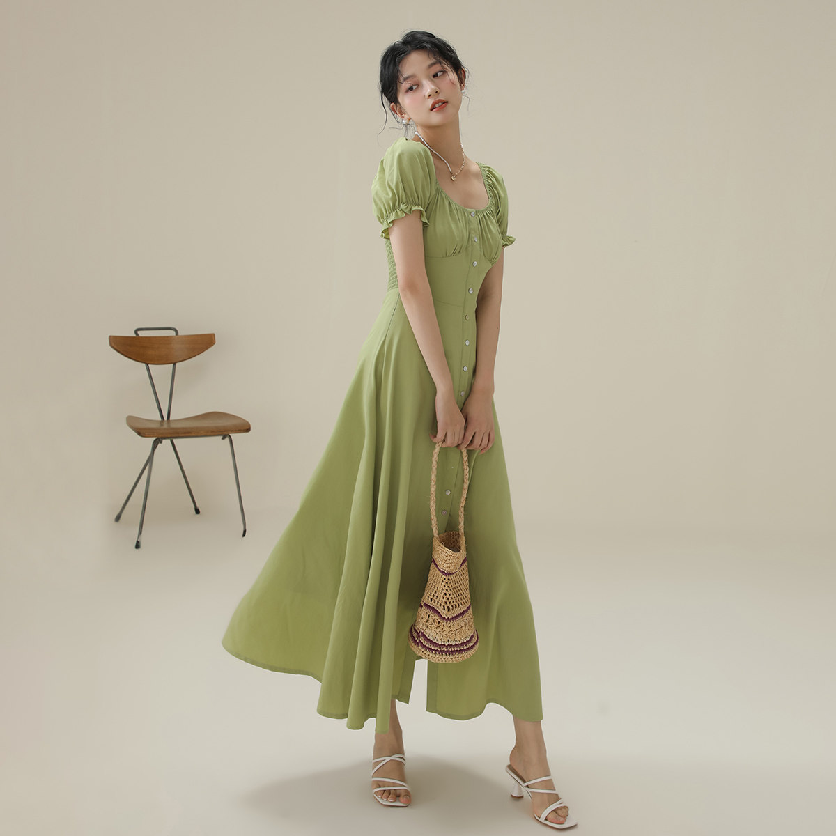 短袖法式泡泡袖连衣裙女2026夏季薄款气质收腰设计感方领长裙