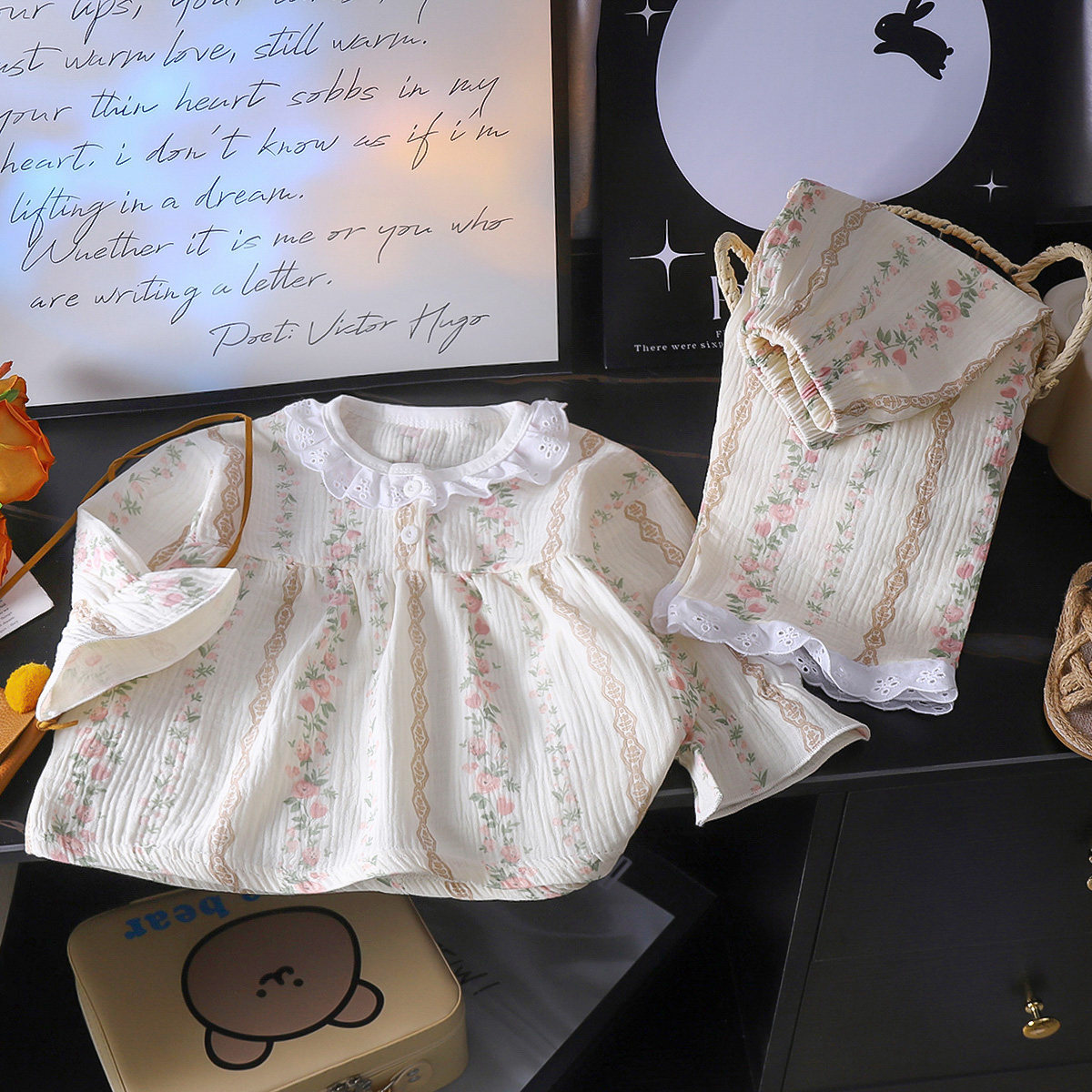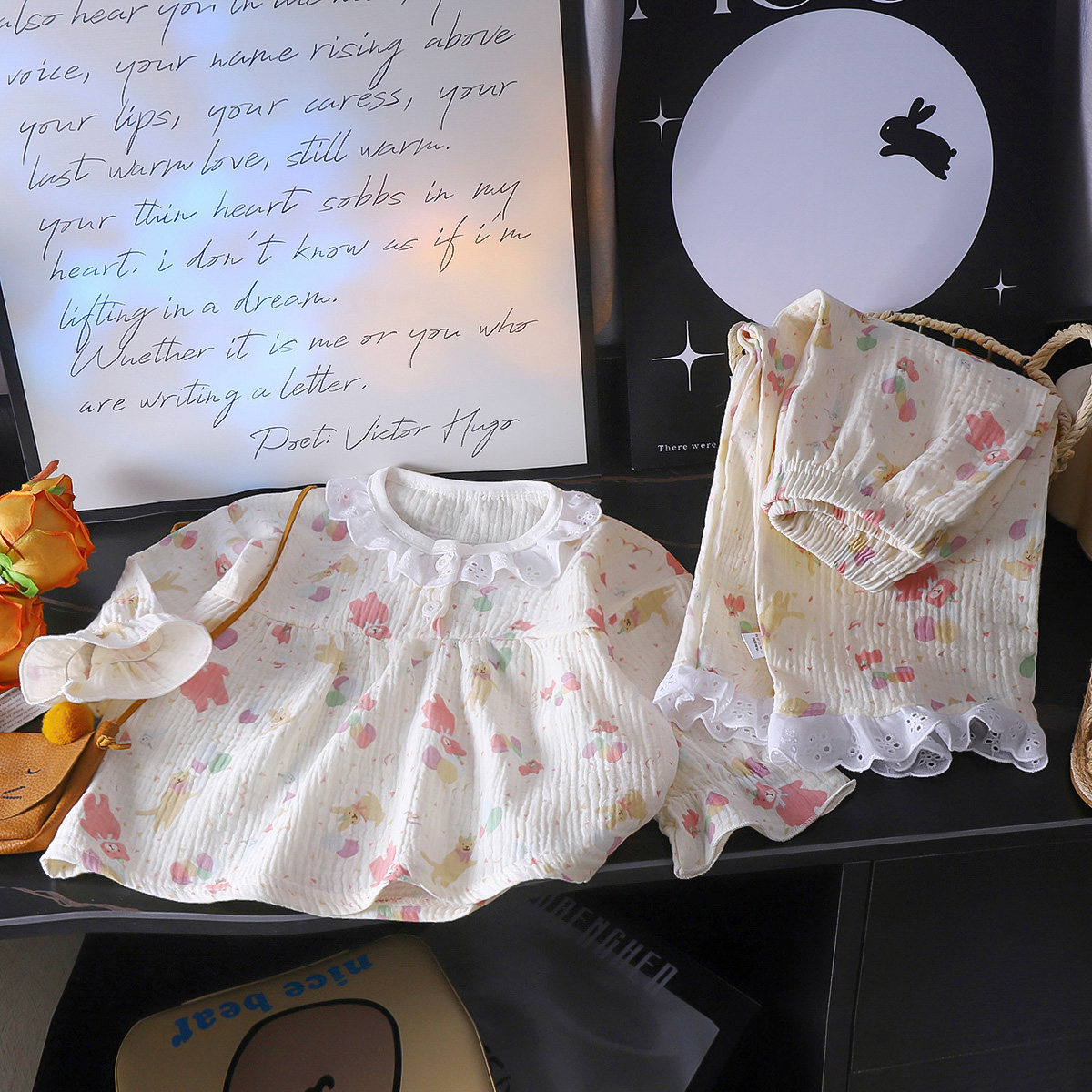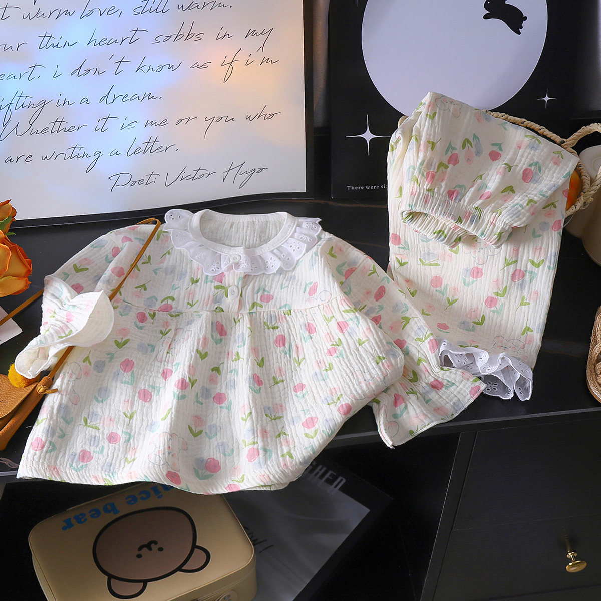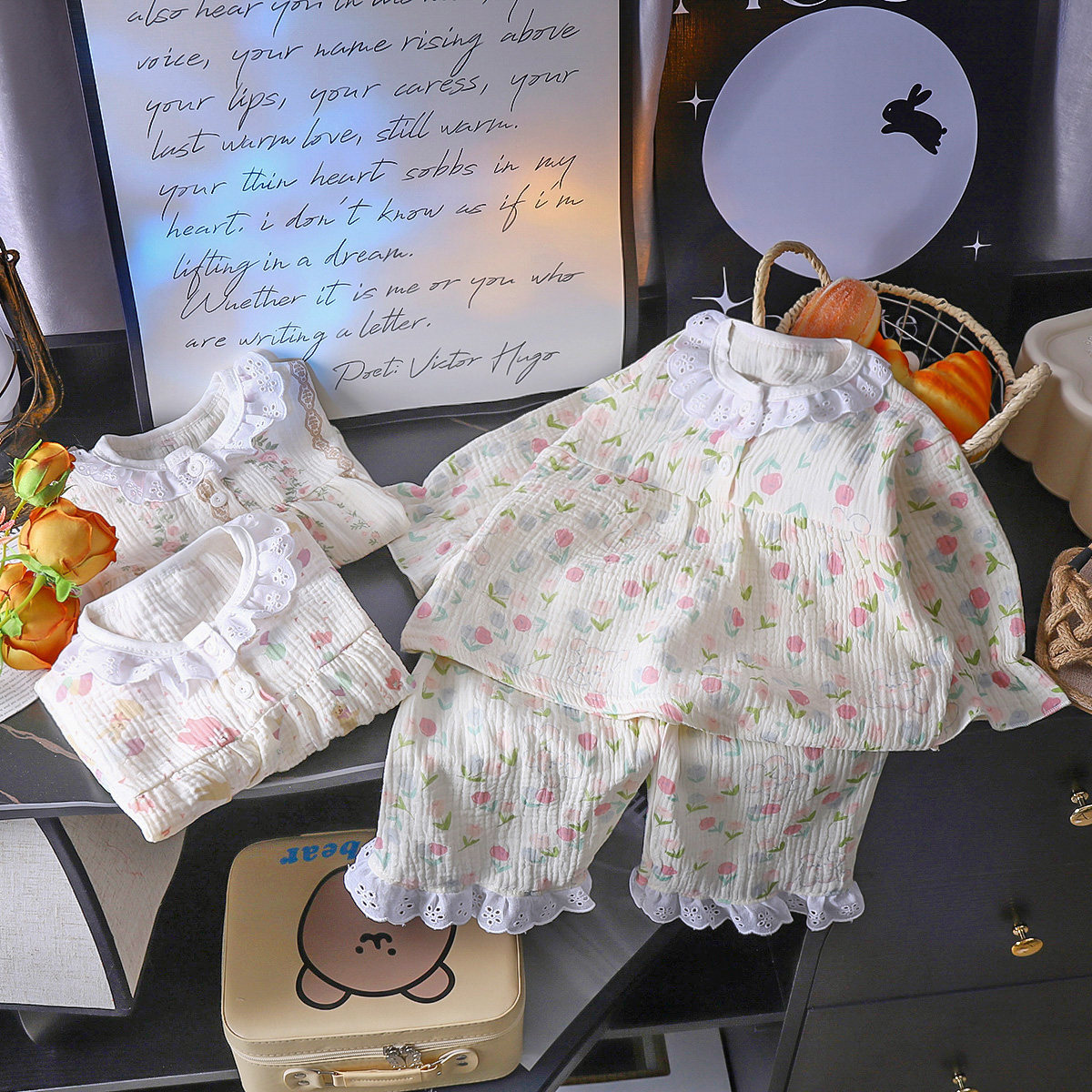 儿童睡衣两件套新款亲子装女童洋气家居服纯棉双层棉纱花边套装