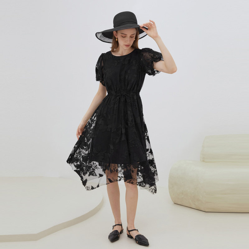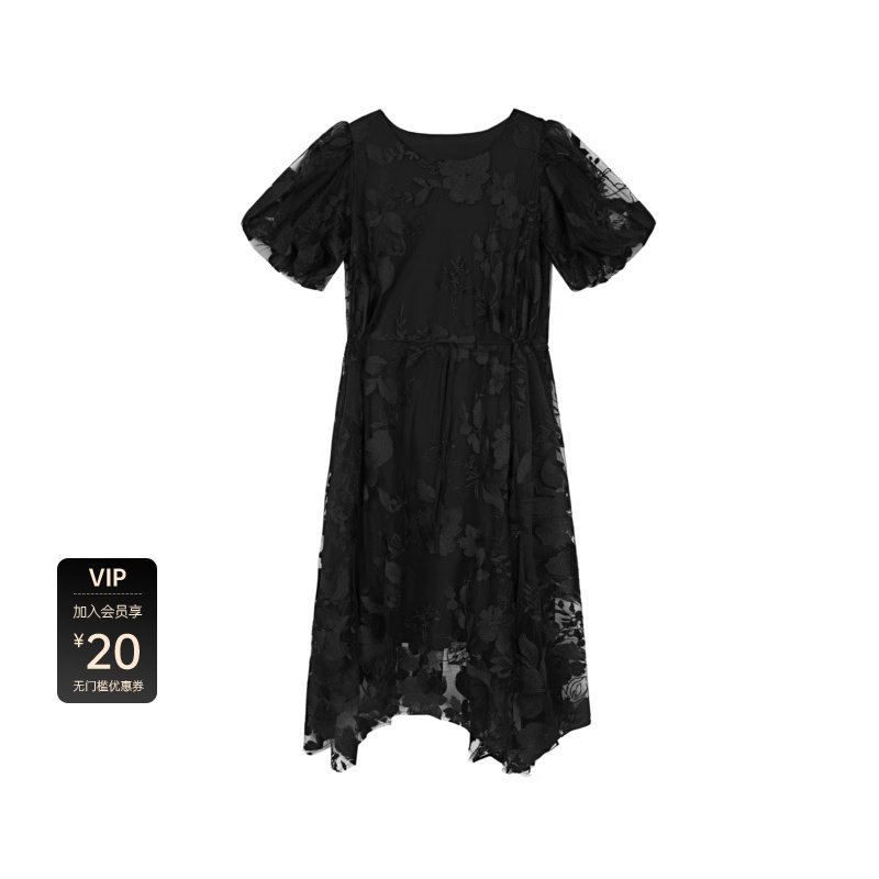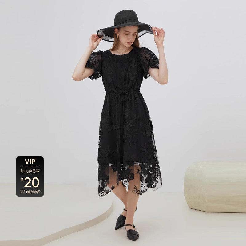 S·DEER圣迪奥女装圆领绣花收腰网纱泡泡袖连衣裙S223Z12C2