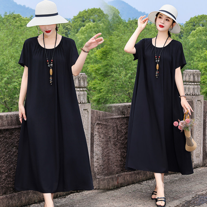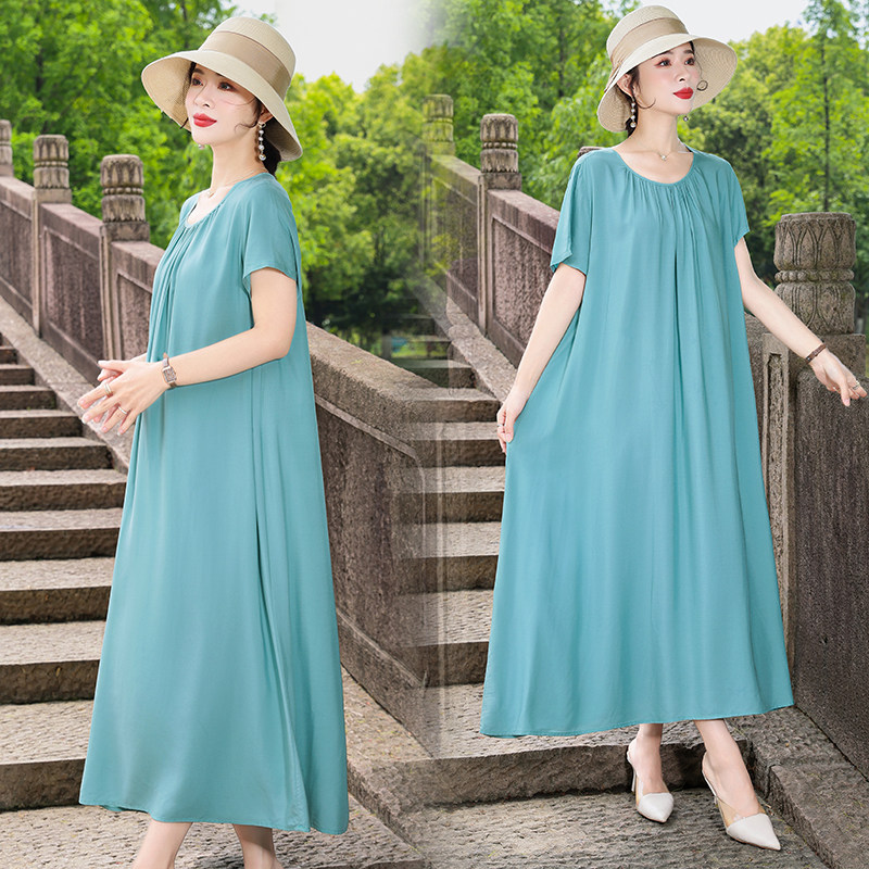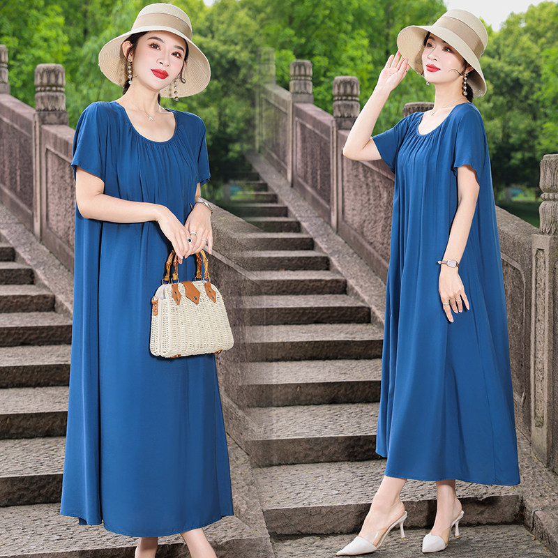 短袖莫代尔长裙大摆显瘦A字超长款打底宽松夏休闲度假连衣裙女装