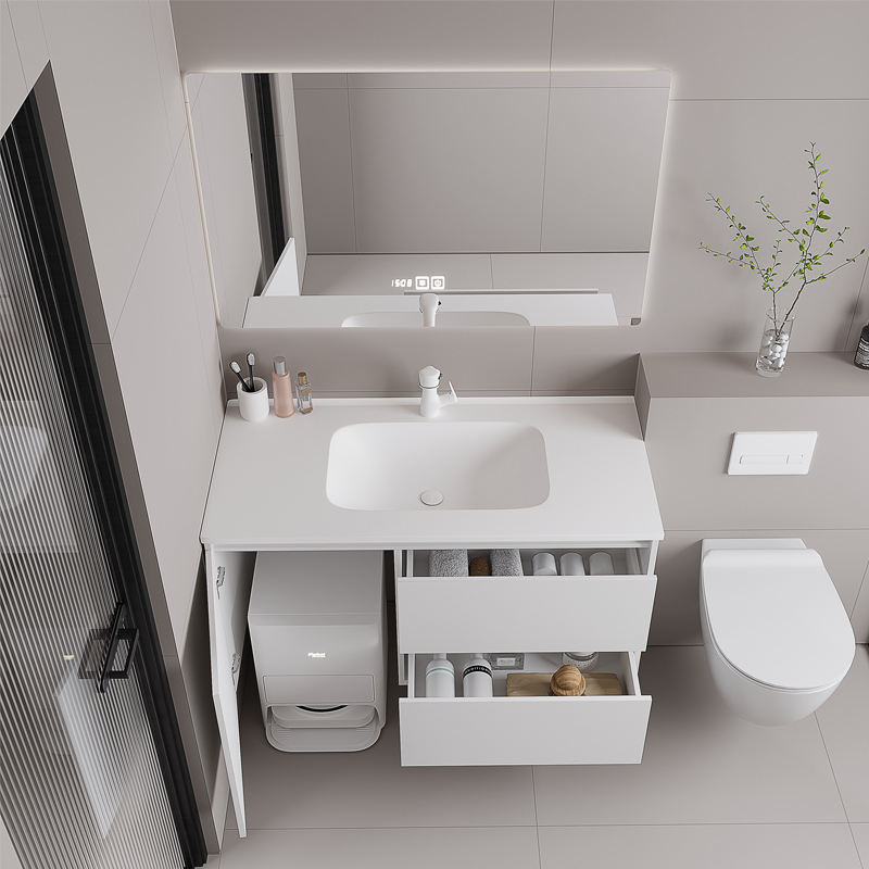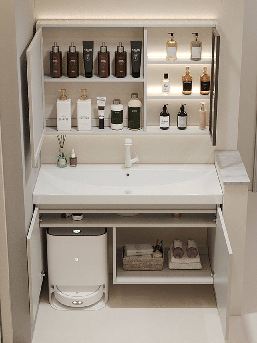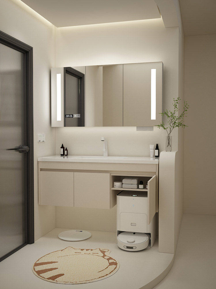 2024新品定制奶油风可丽耐一体盆浴室柜组合智能扫地机基站收纳卫